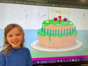 Ze straalt en lacht, wat een feest, hoera!Met lekkere cakejes, smullen maar,vieren we samen haar zevende jaar!