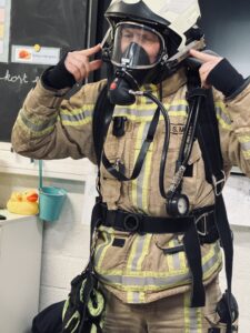 In ons thema ‘Help, bel 112’ leren we over hulpdiensten en echte helden. Vandaag kwam brandweerman Steven in de klas. We mochten het zware pak…