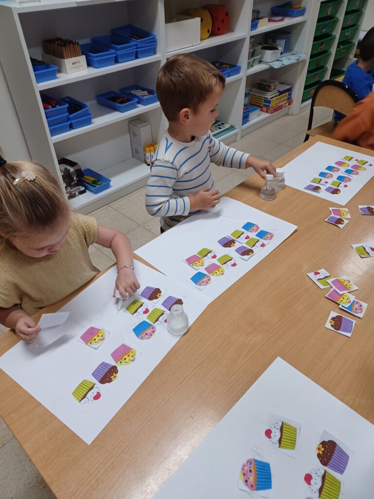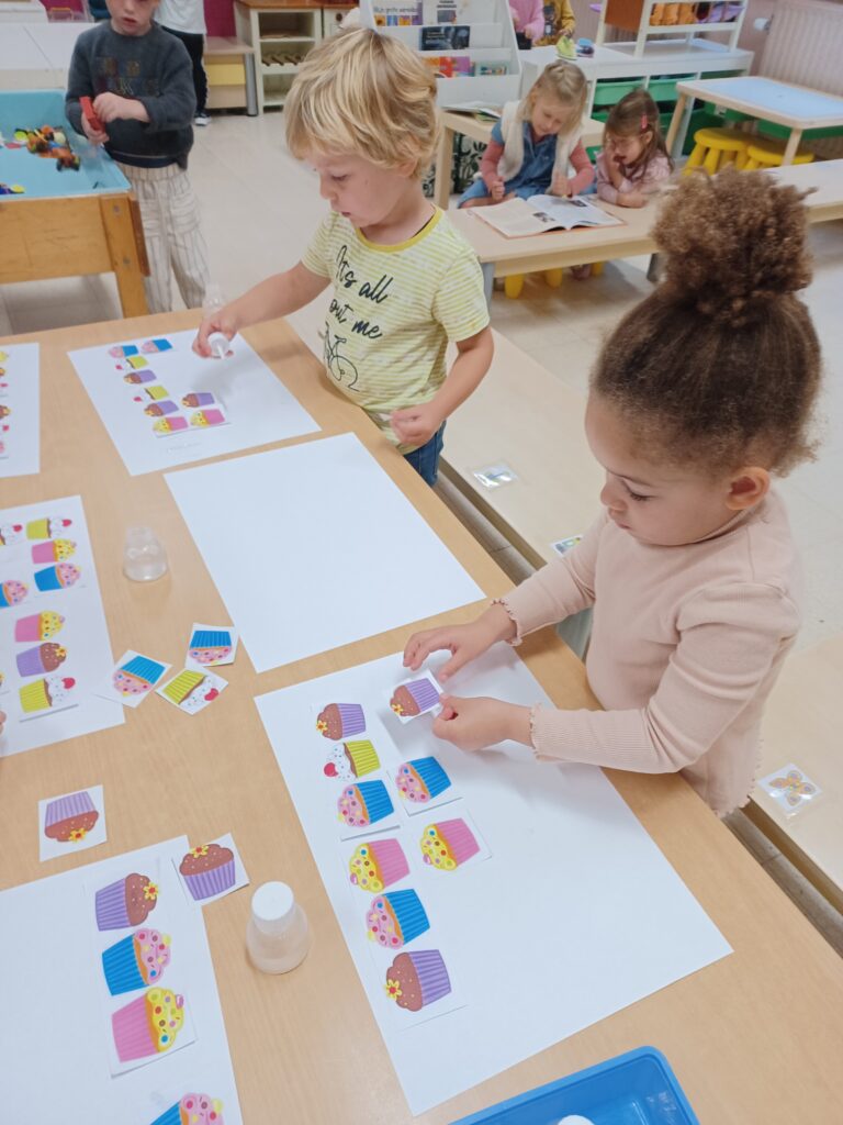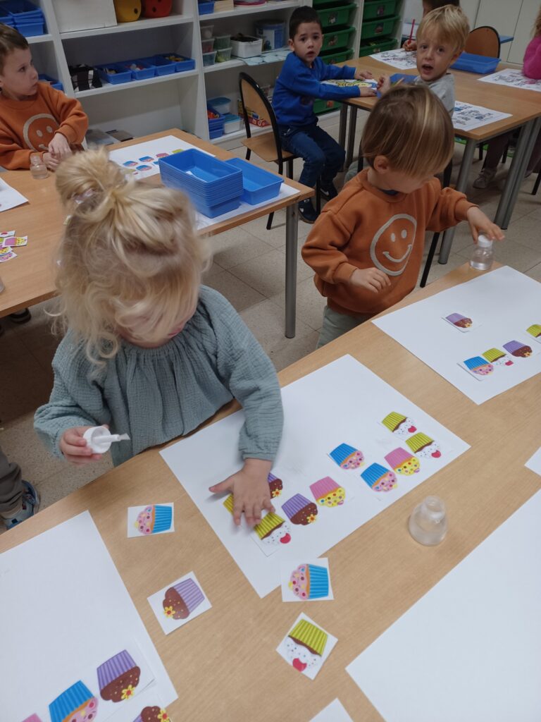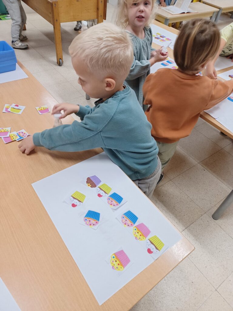 We hebben onze verjaardagskroon geknikkerschilderd. We stempelden een verjaardagstaart, we versierden een taart met verfstiften, we speelden met scheerschuim (taart versieren met lijnen, punten, vormen,….). We puzzelden een prent van onze jarige klaspop Puk.
