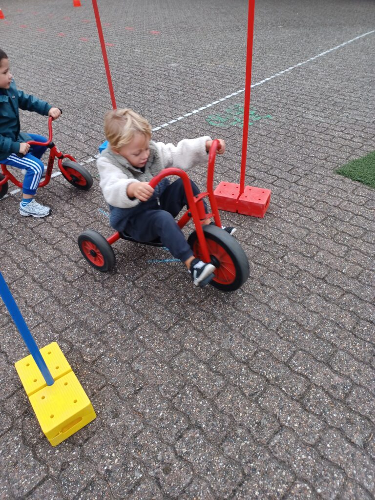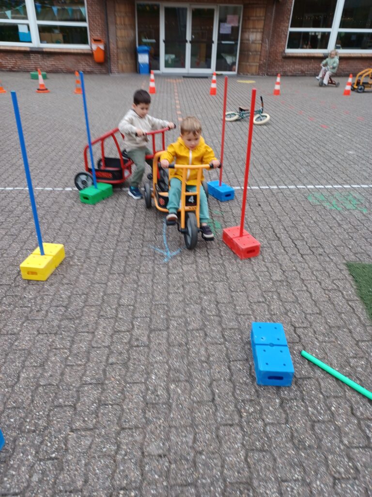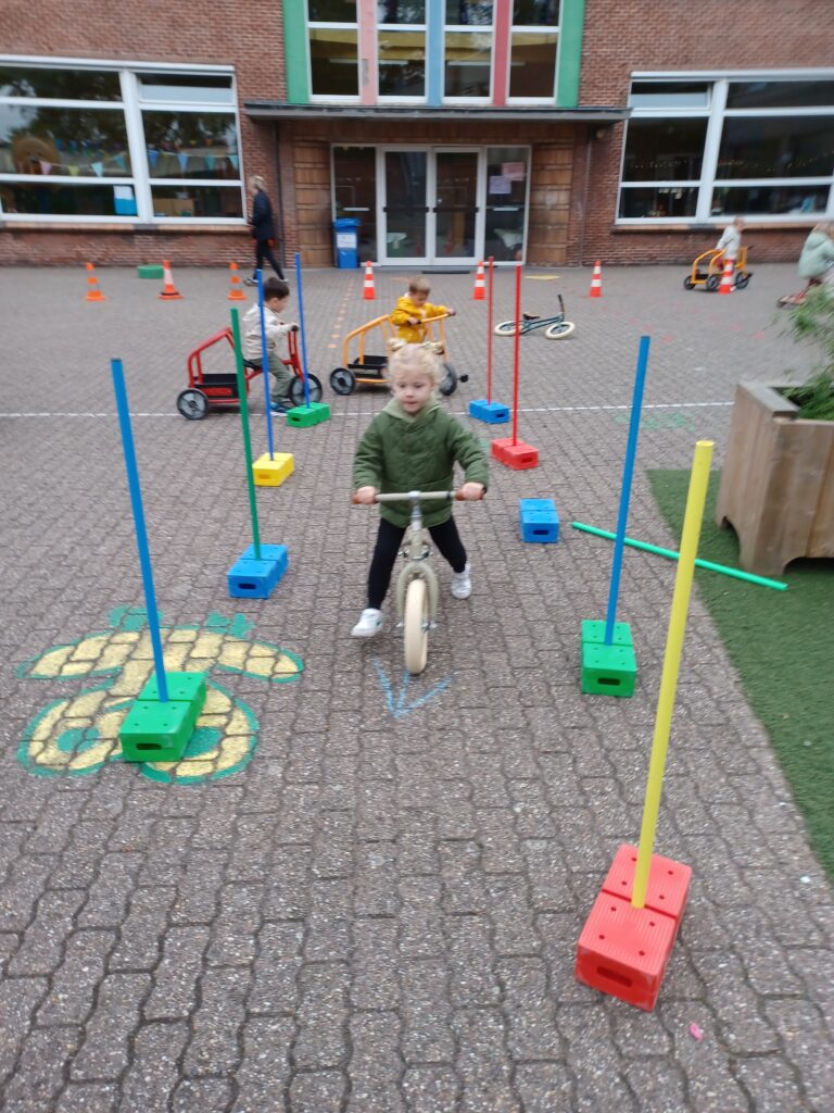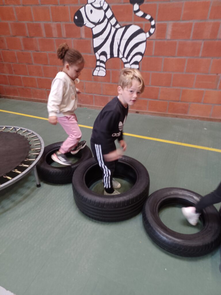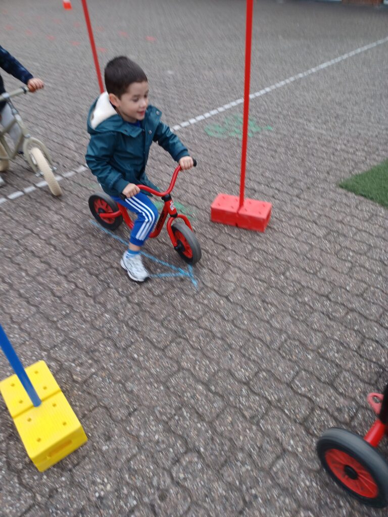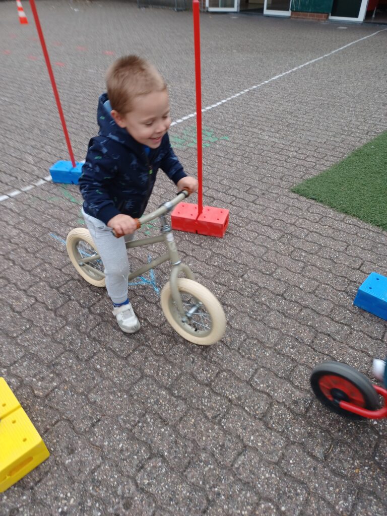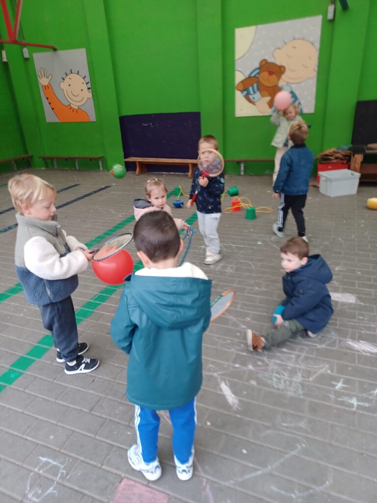 We mochten met de ballen spelen; met de fietsen rijden; met loopklossen, springballen, tennisraketten spelen en als laatste legden we een parcours af in de gymzaal.
