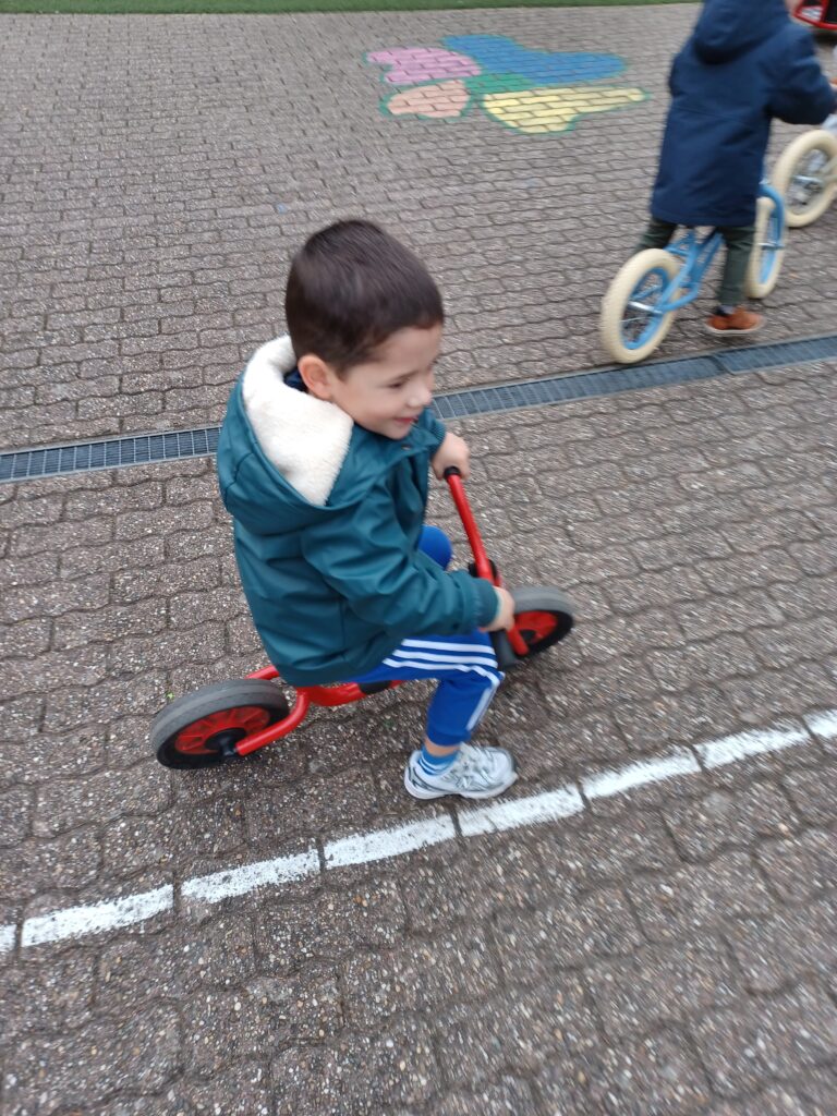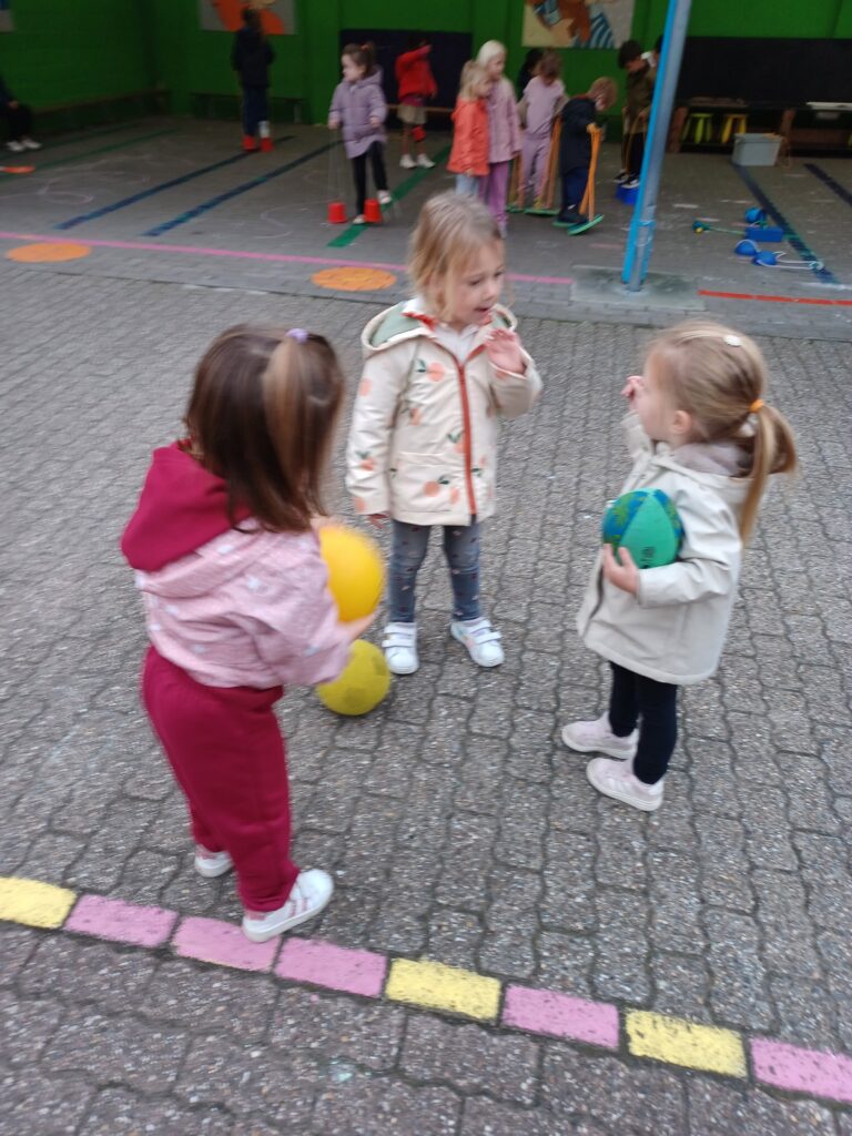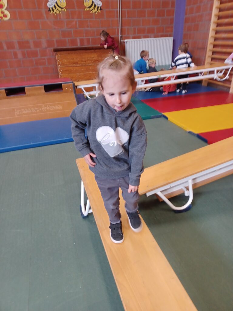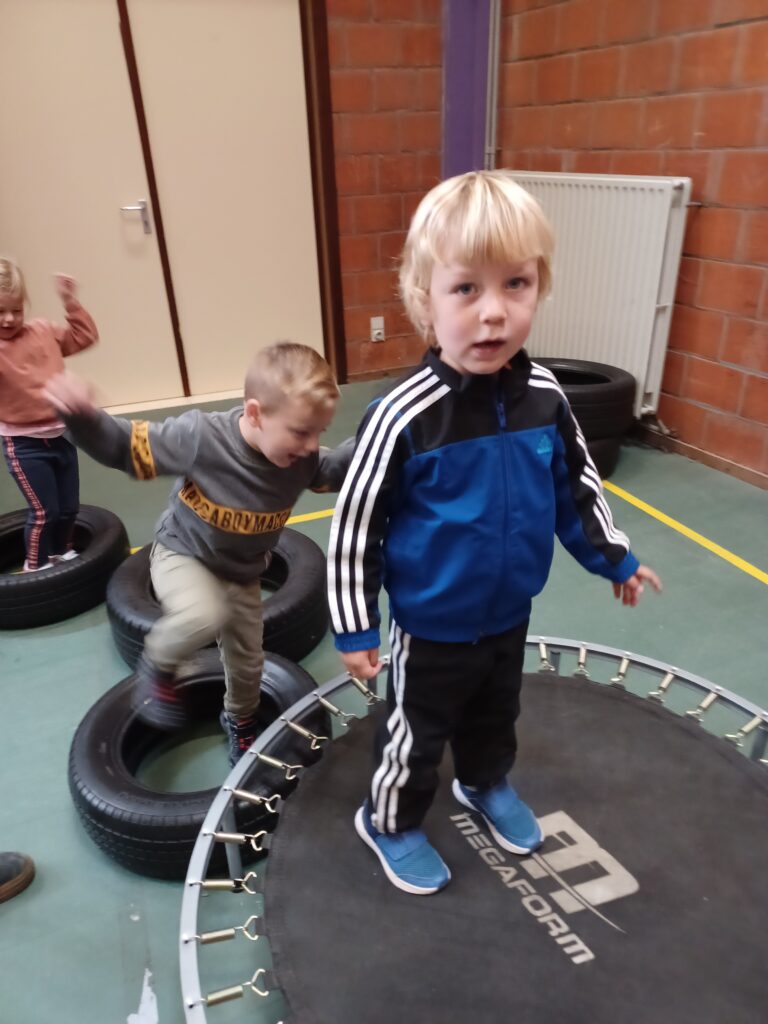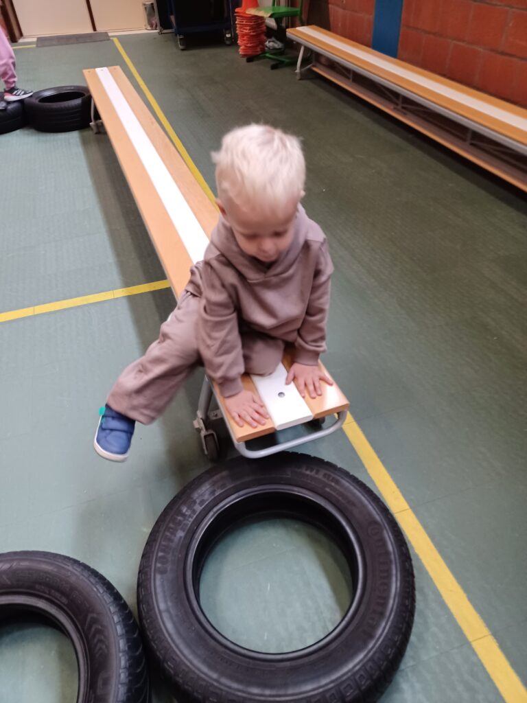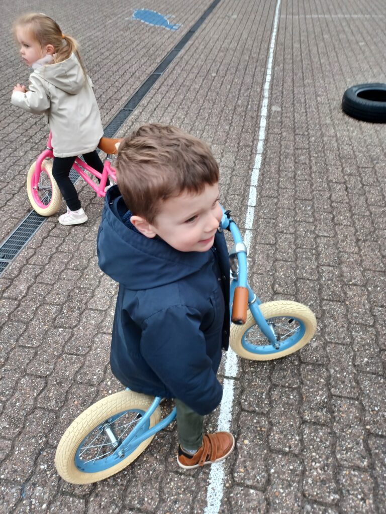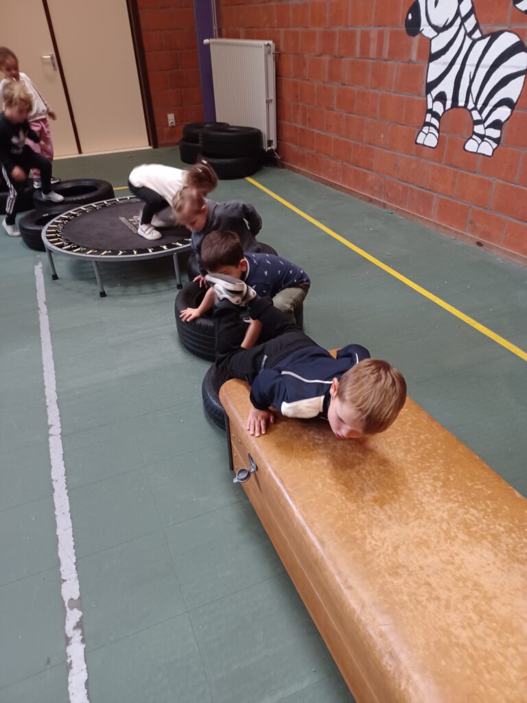 We mochten met de ballen spelen; met de fietsen rijden; met loopklossen, springballen, tennisraketten spelen en als laatste legden we een parcours af in de gymzaal.