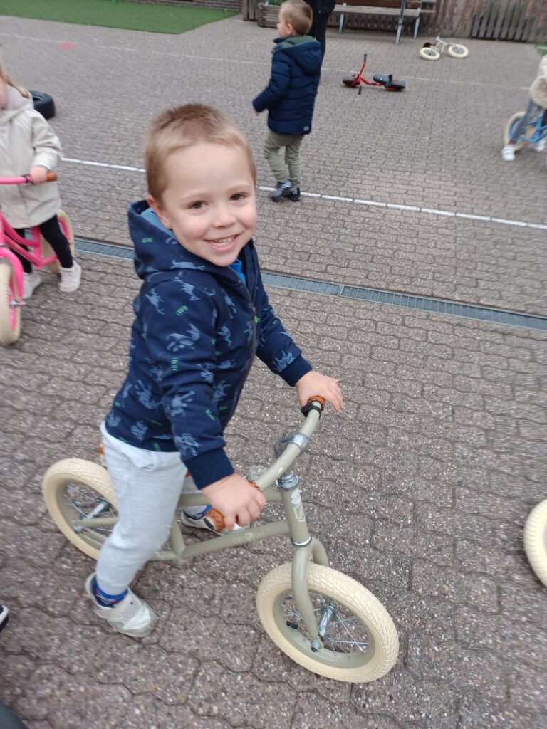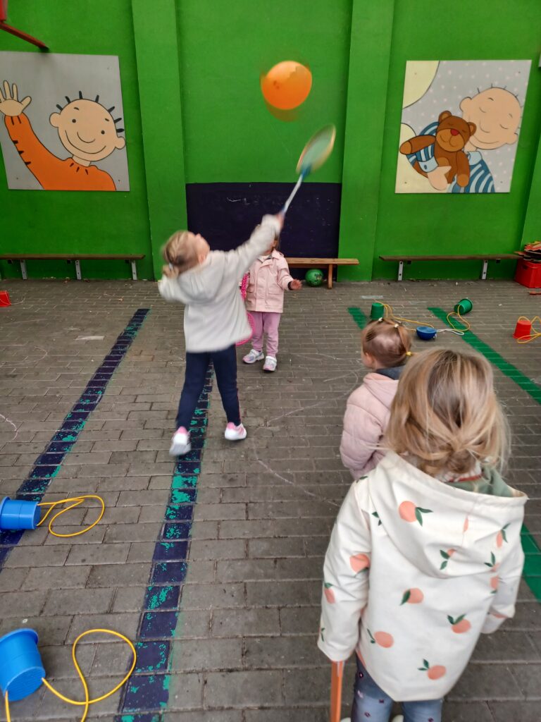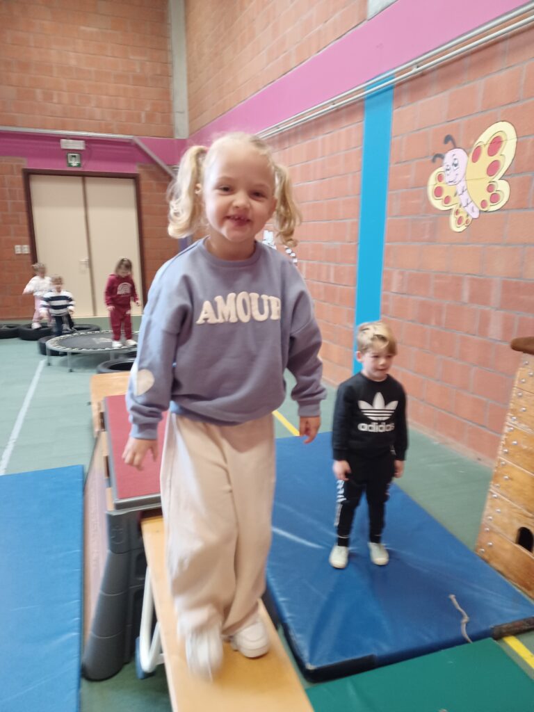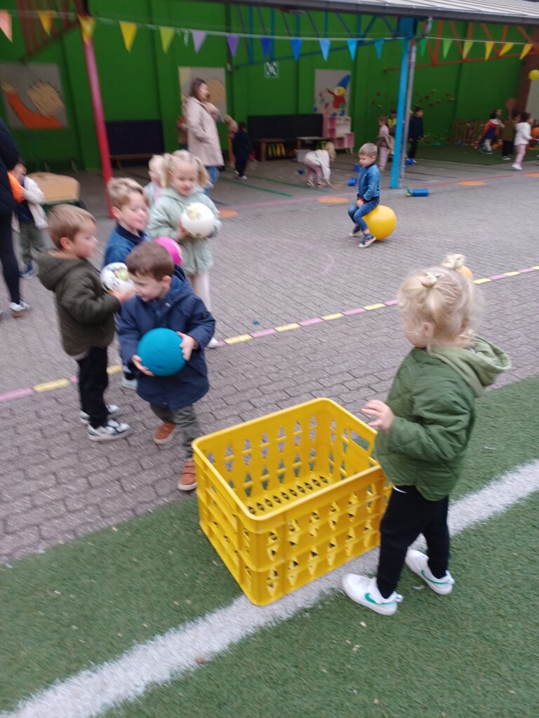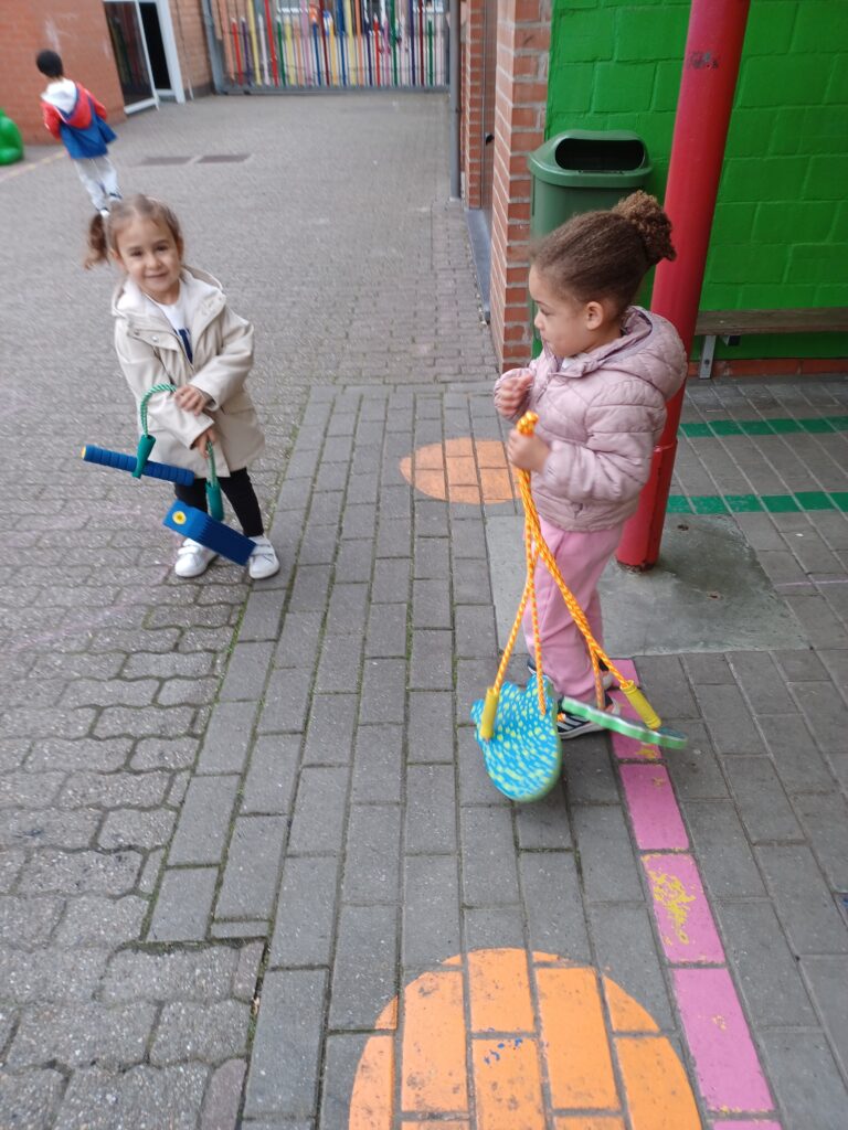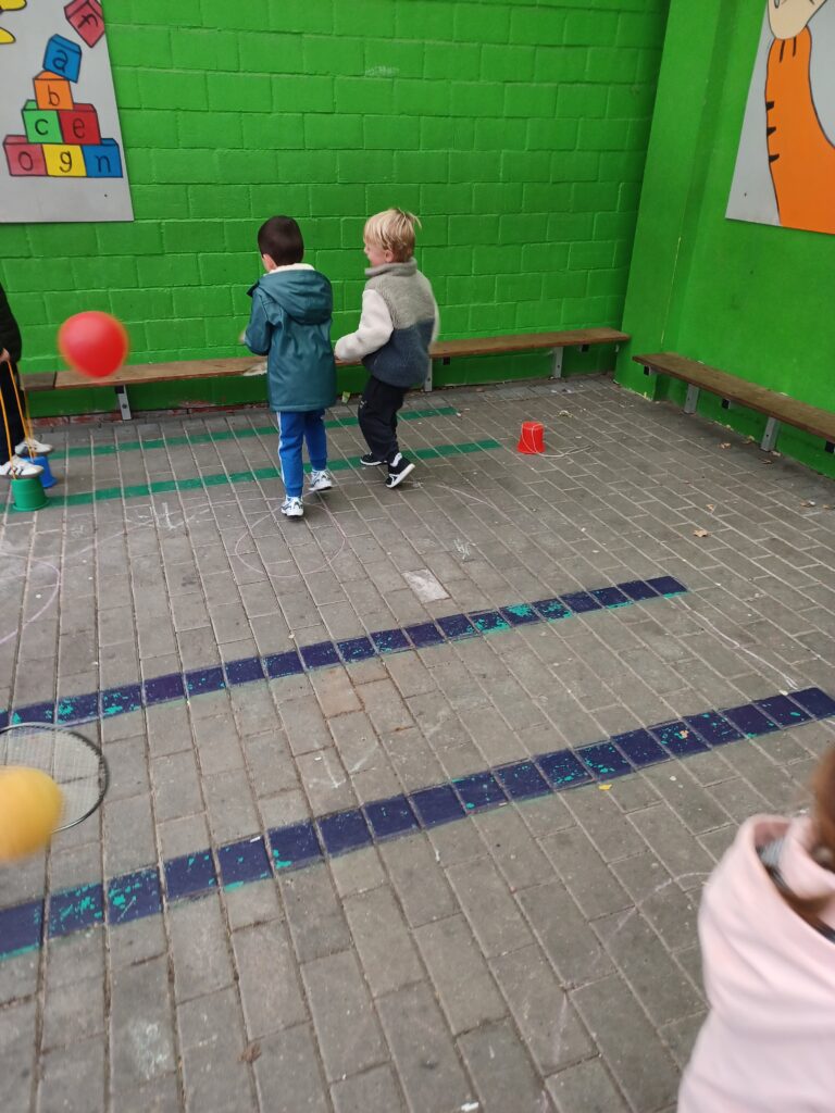 We mochten met de ballen spelen; met de fietsen rijden; met loopklossen, springballen, tennisraketten spelen en als laatste legden we een parcours af in de gymzaal.