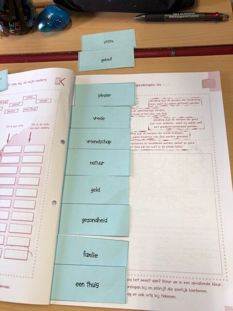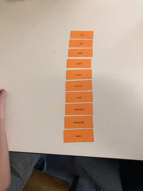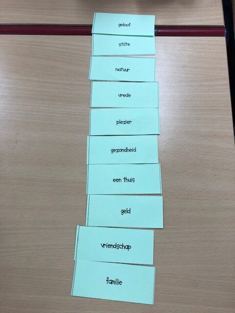 In de godsdienstles hadden we het over waarden die ons gelukkig maken, zoals vrede, vriendschap, een thuis, familie, een goede gezondheid, … De kinderen werden in groepjes verdeeld en moesten overeenkomen om een waarden top 10 op te stellen waarmee iedereen van de groep akkoord ging. Dat zorgde soms wel voor een discussie. Hier zijn de resultaten. De foto’s van de groepjes en de top 10 ’s staan door elkaar.
