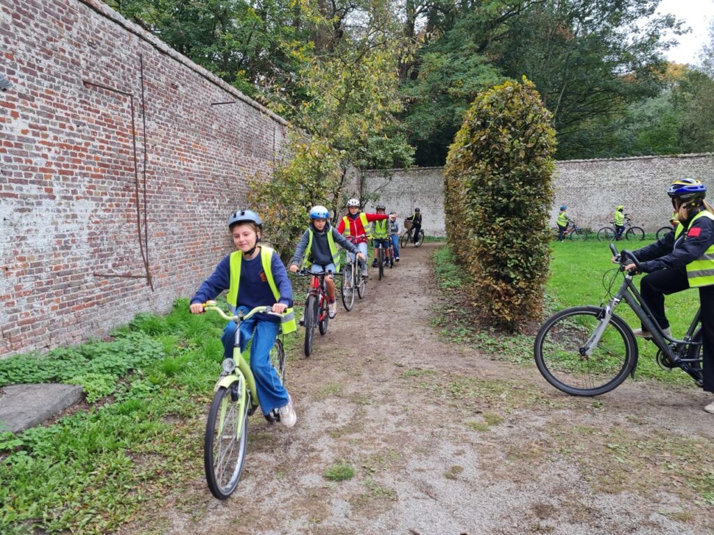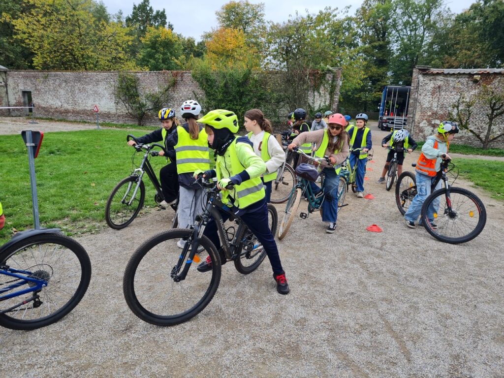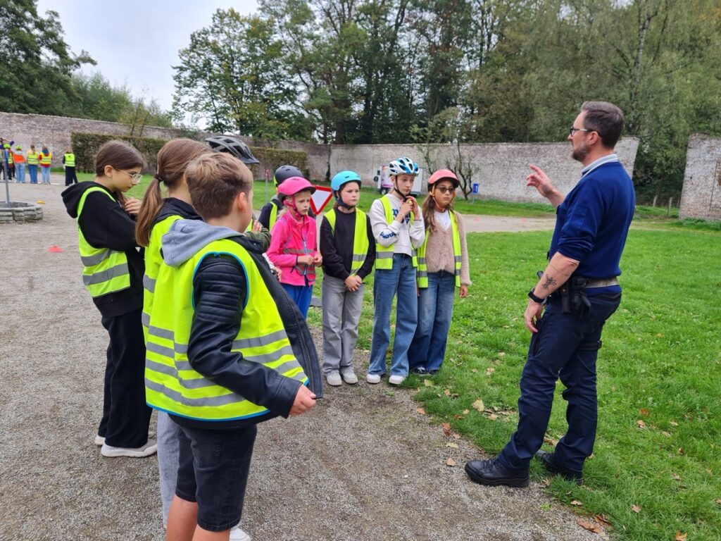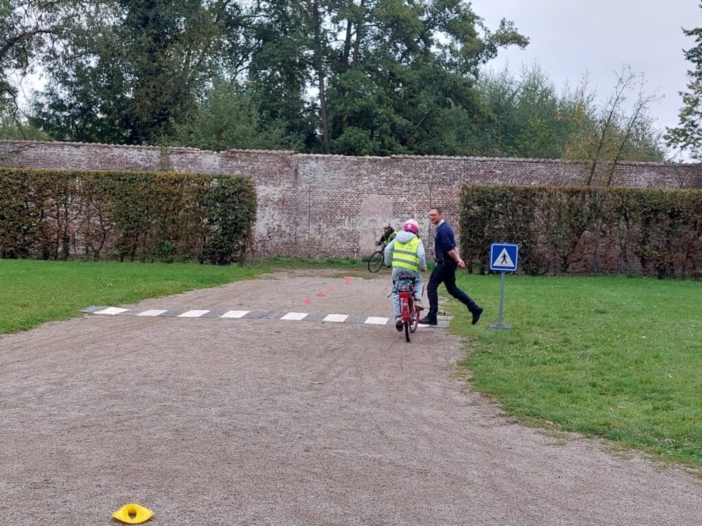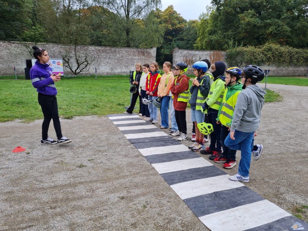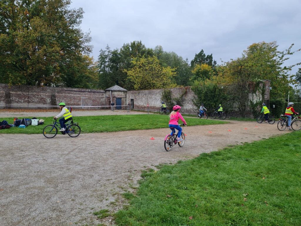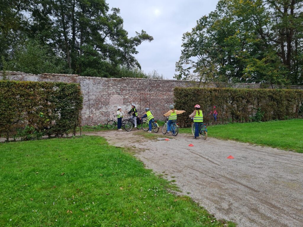 Fietsen naar het kasteel van Wippelgem, een behendigheidsparcours, een verkeerspark, kennismaken met de dode hoek en dit ondervinden in de cabine van een vrachtwagen, fietstechnieken, EHBO, promillebrillen uitproberen,… Een leerrijke dag!