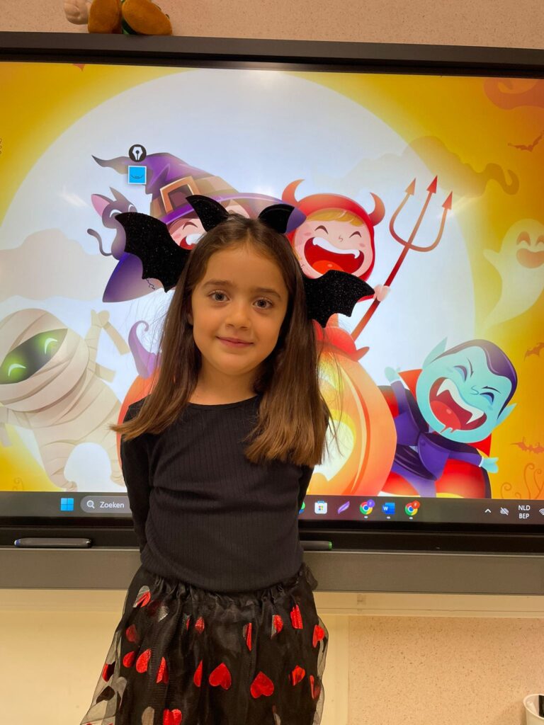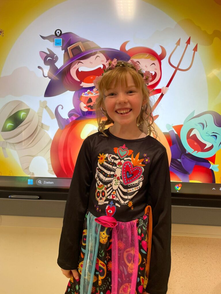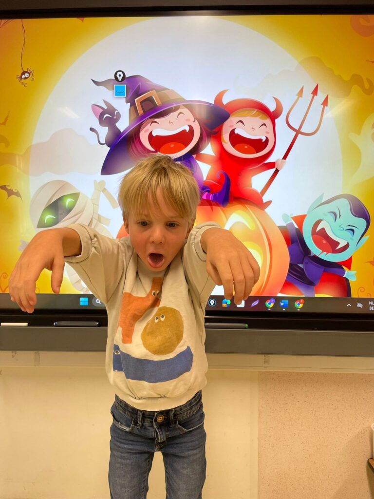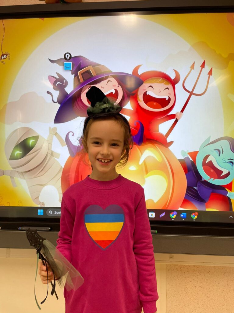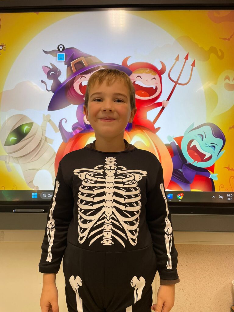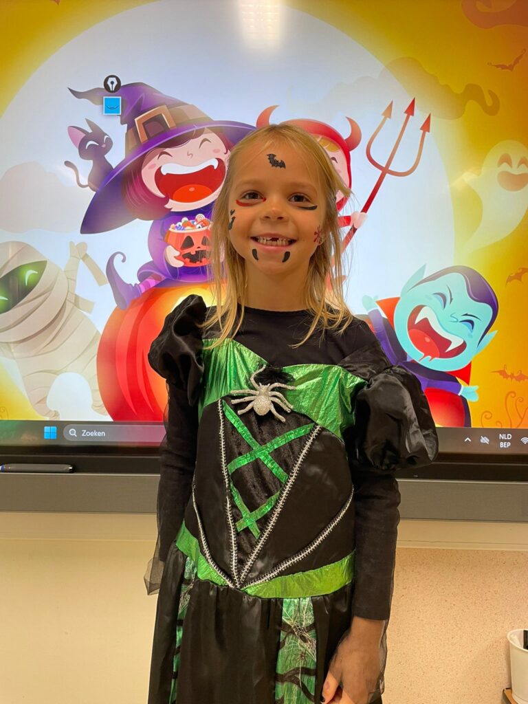 Vandaag vierden we Halloween in de klas! Iedereen kwam prachtig verkleed: heksen, spoken, skeletten en nog veel meer. Wat zag iedereen er griezelig leuk uit! 🧙♀️🕷️