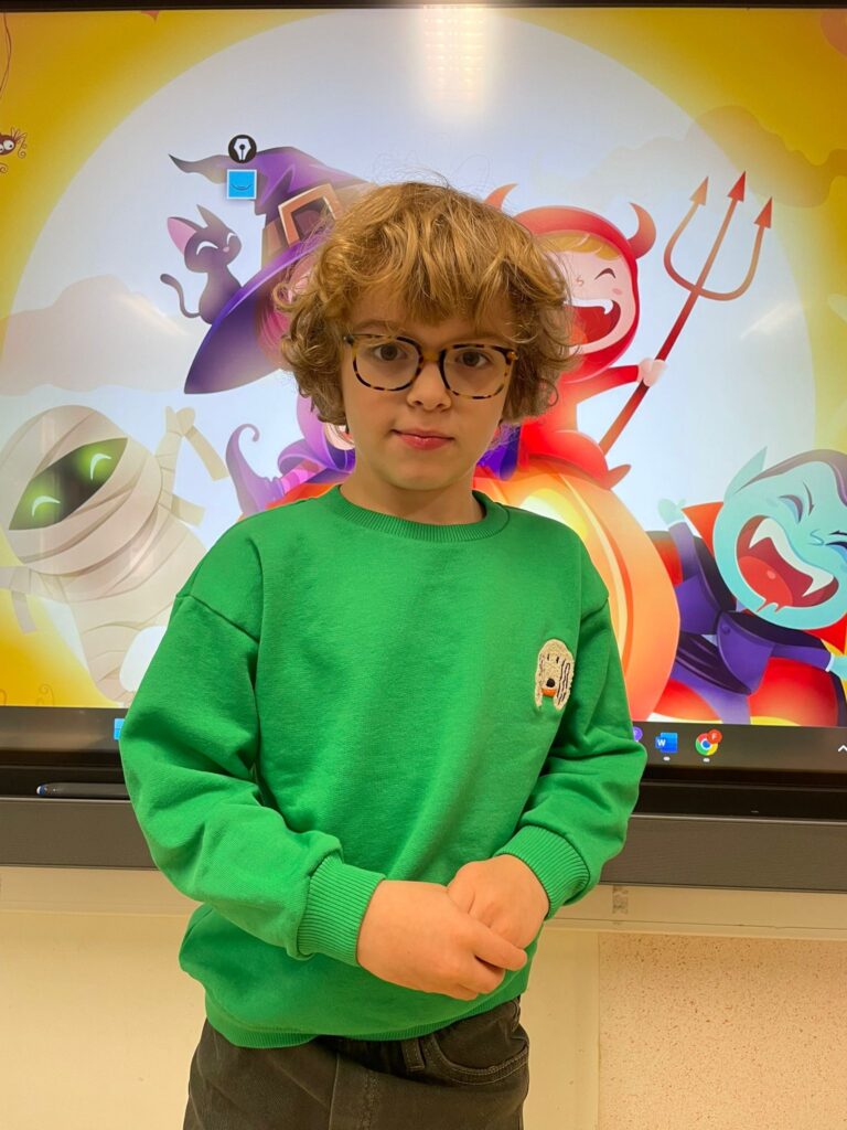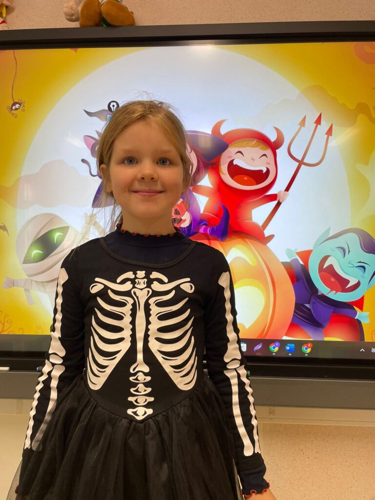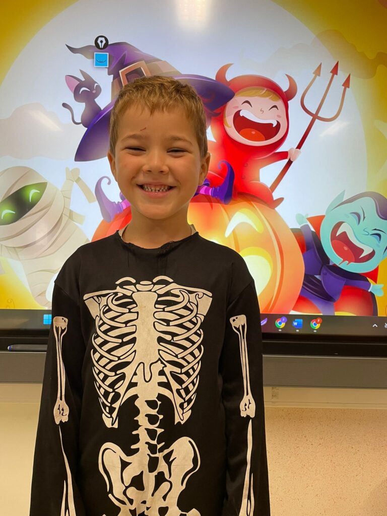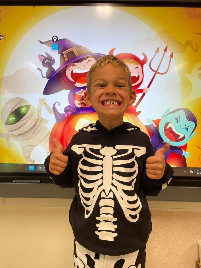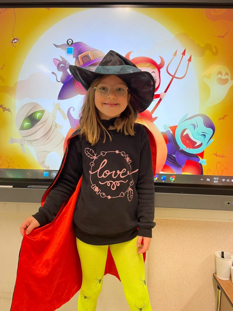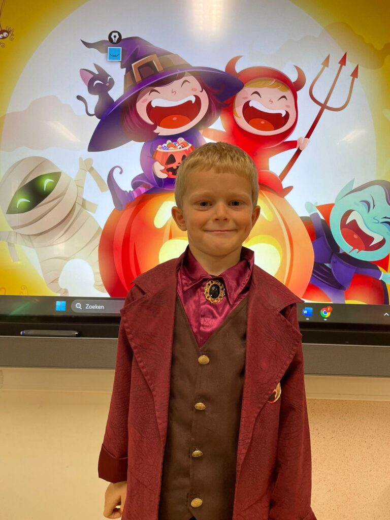 Vandaag vierden we Halloween in de klas! Iedereen kwam prachtig verkleed: heksen, spoken, skeletten en nog veel meer. Wat zag iedereen er griezelig leuk uit! 🧙♀️🕷️