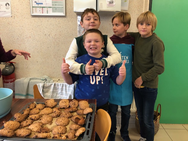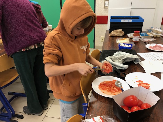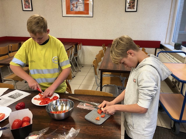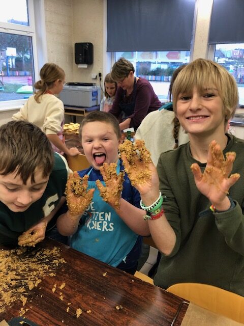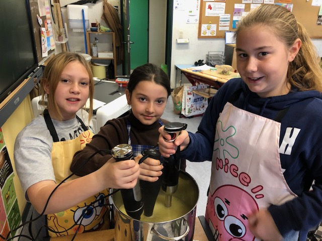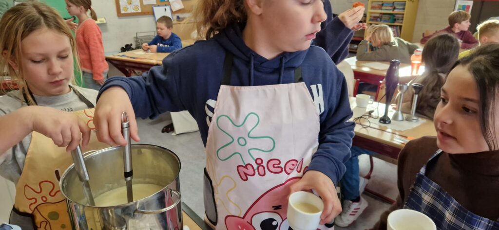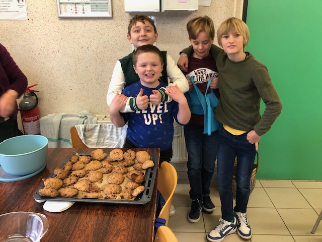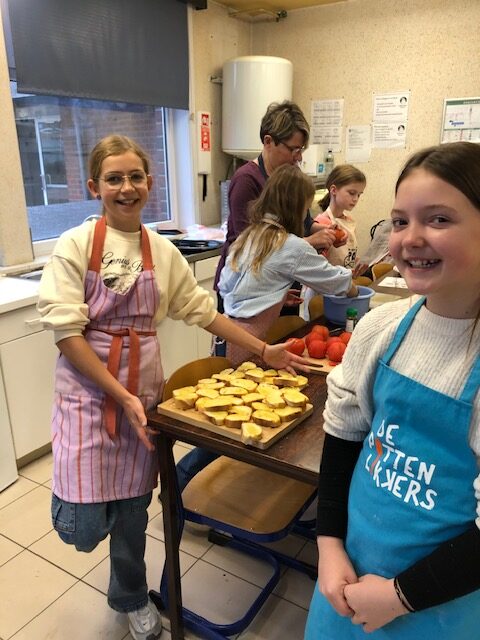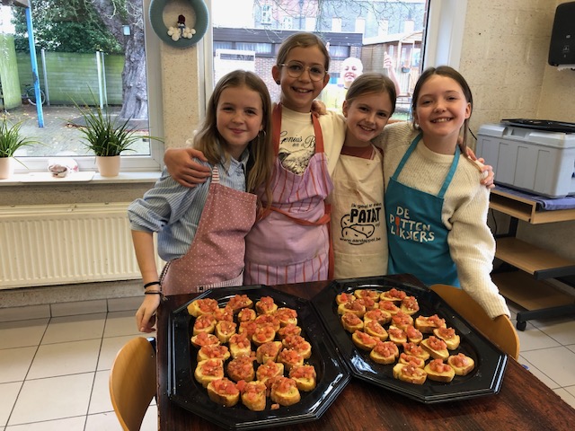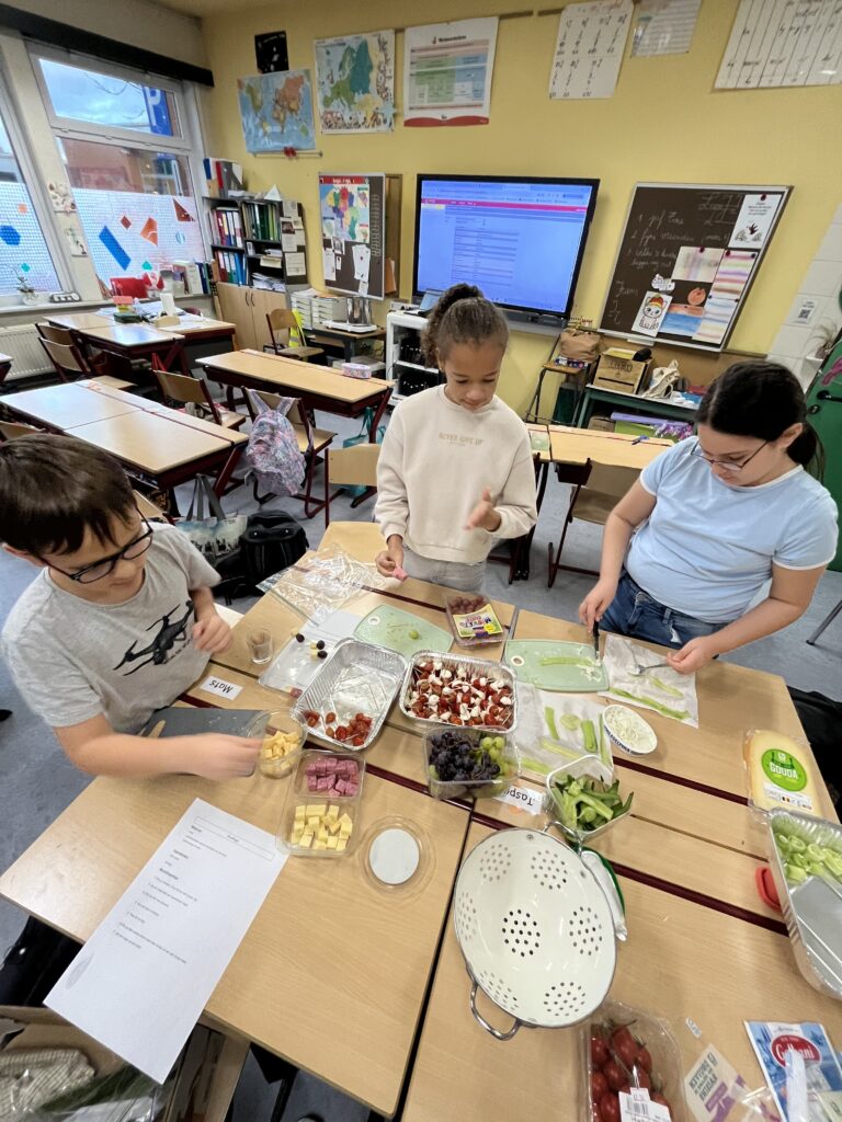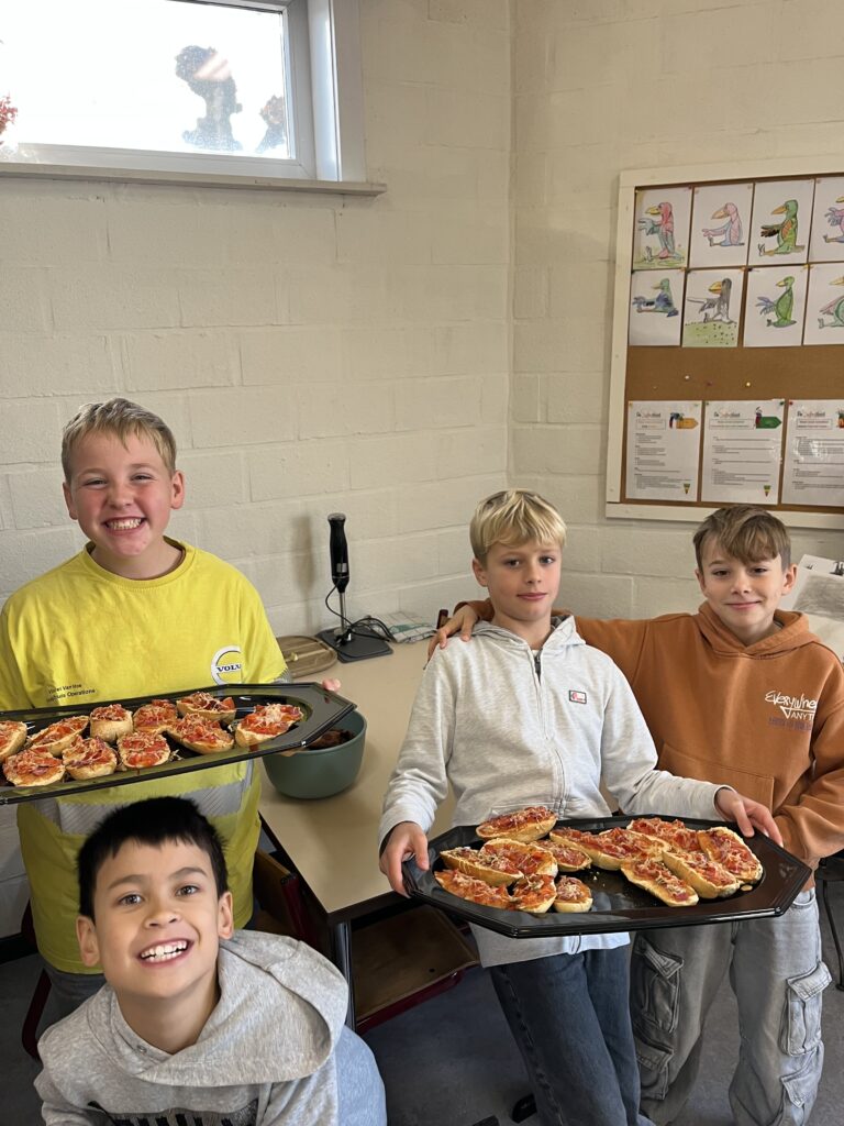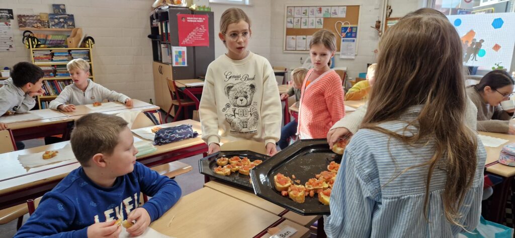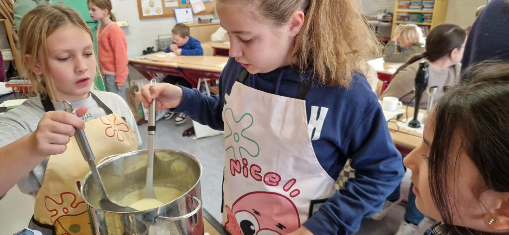 In de lessen Nederlands werkten we met de tekstsoort: instructies. We leerden recepten lezen en stap voor stap werken. Om te tonen dat we dat konden, maakten we in groepjes zelf een gerechtje klaar dat we daarna lekker mochten opeten, mmmm!