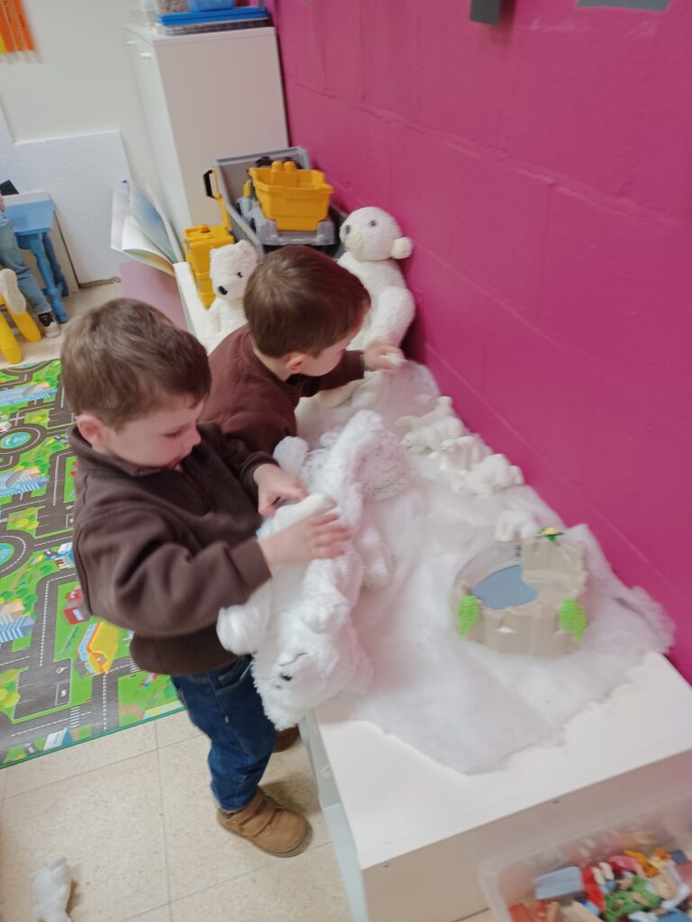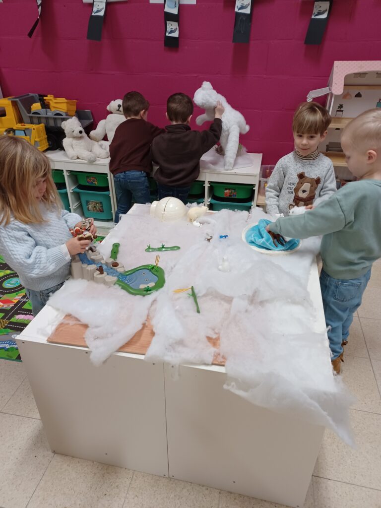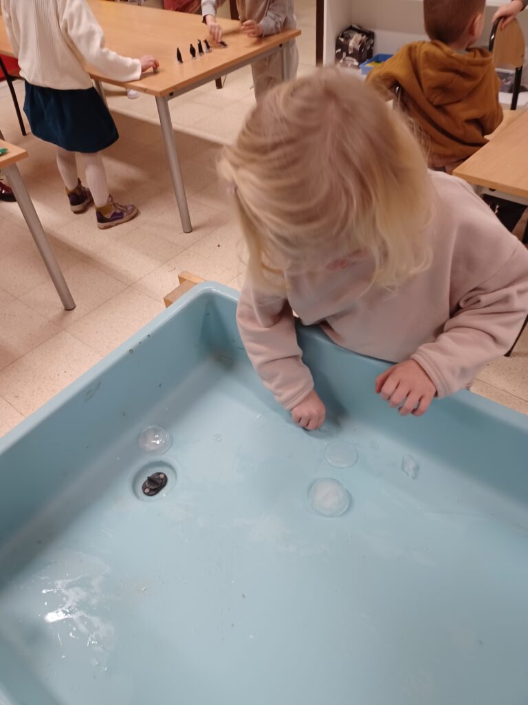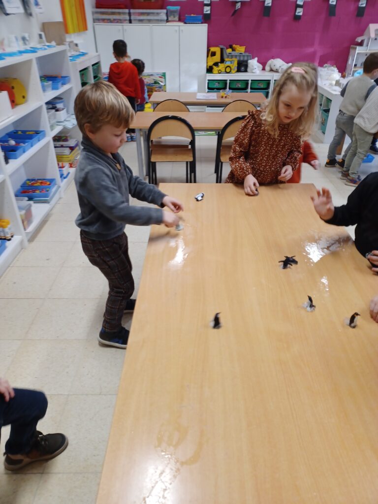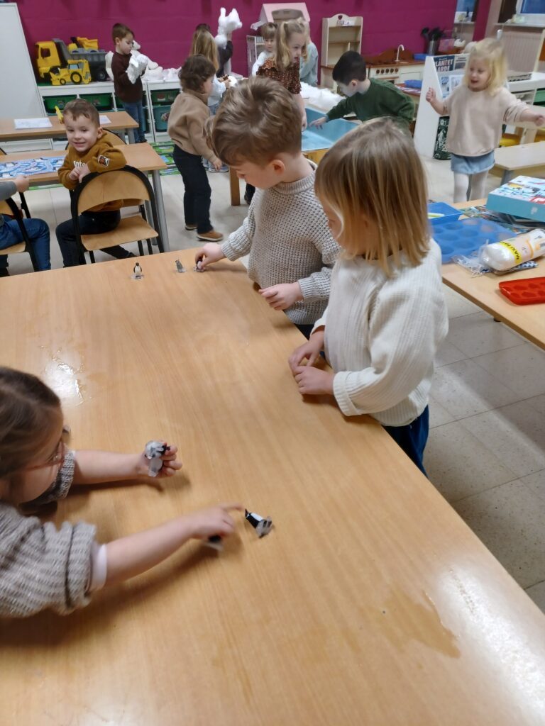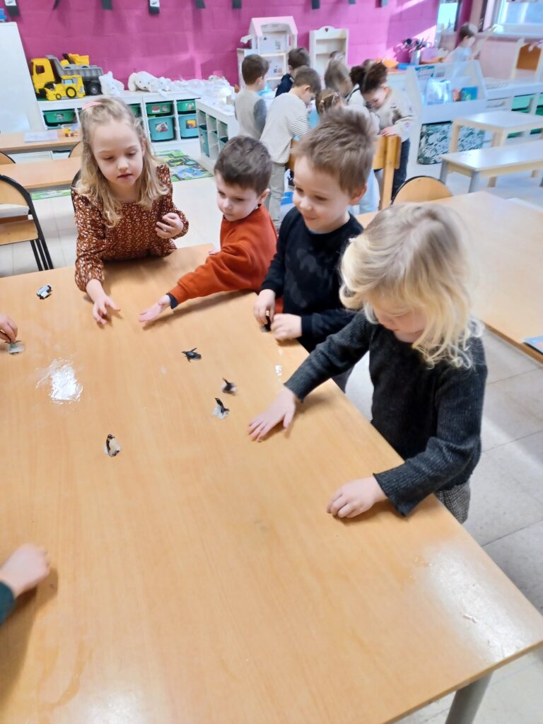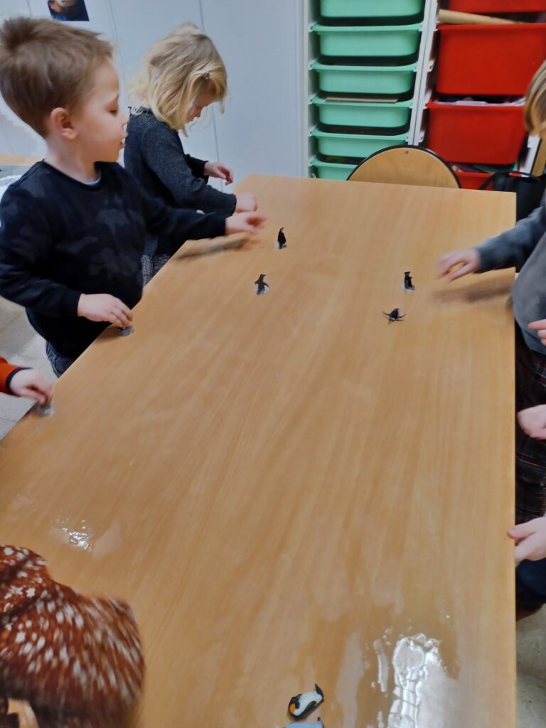 We knutselden, speelden spelletjes, gaven de pinguïn eten, we visten met magneten, we speelden met zelfgemaakte sneeuw, we experimenteerden met ijs, deden aan ijskappen, we mochten op de skilatten staan en sleeën in de gang. Kortom we hadden veel plezier.
