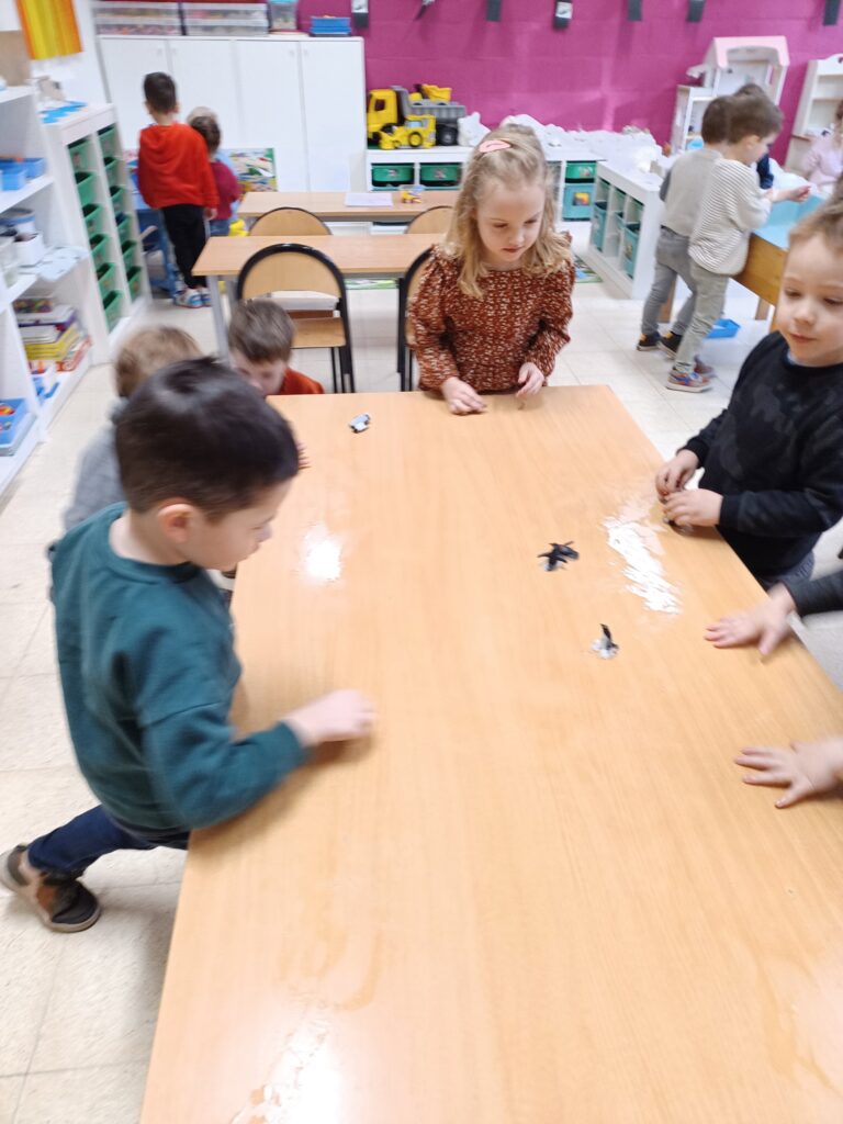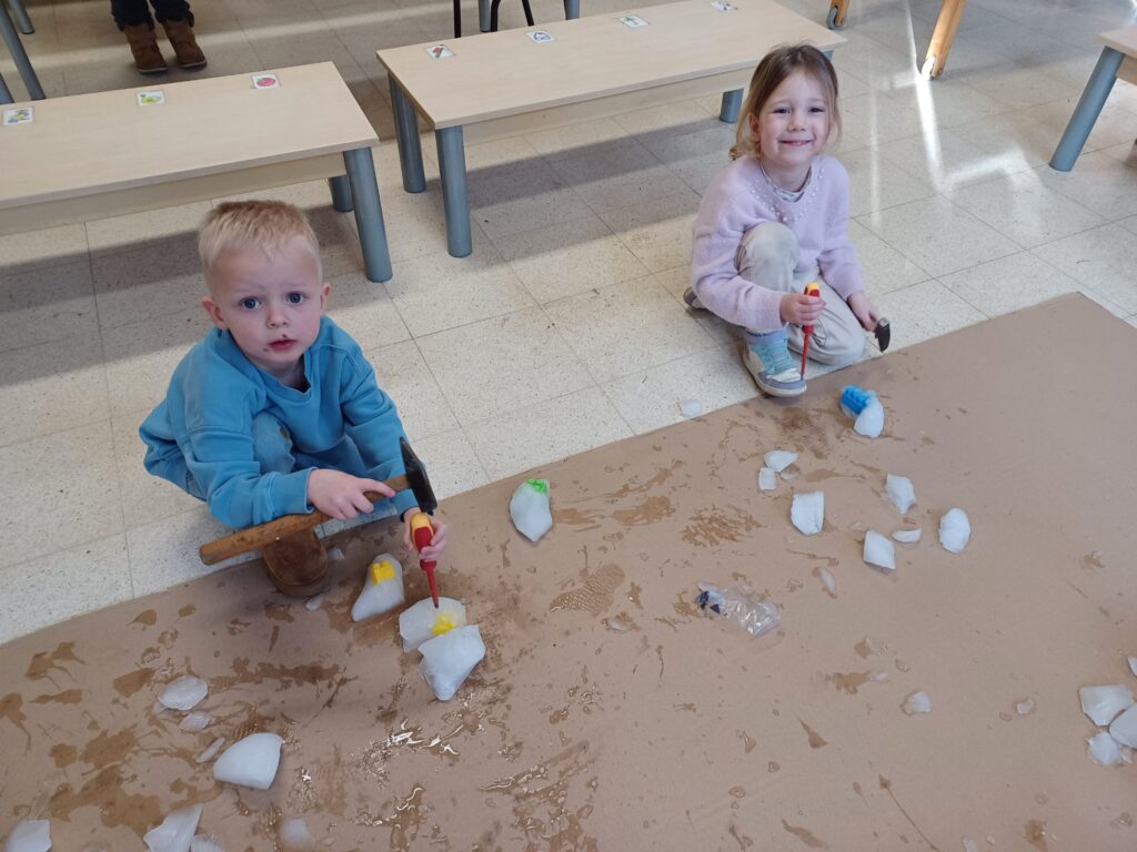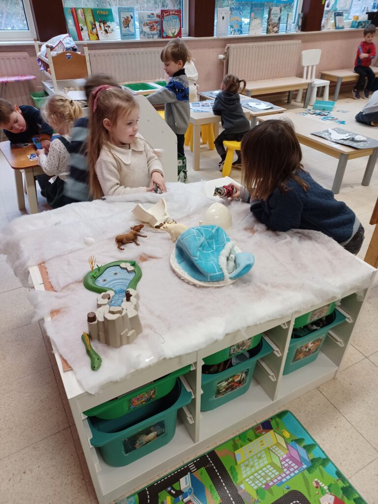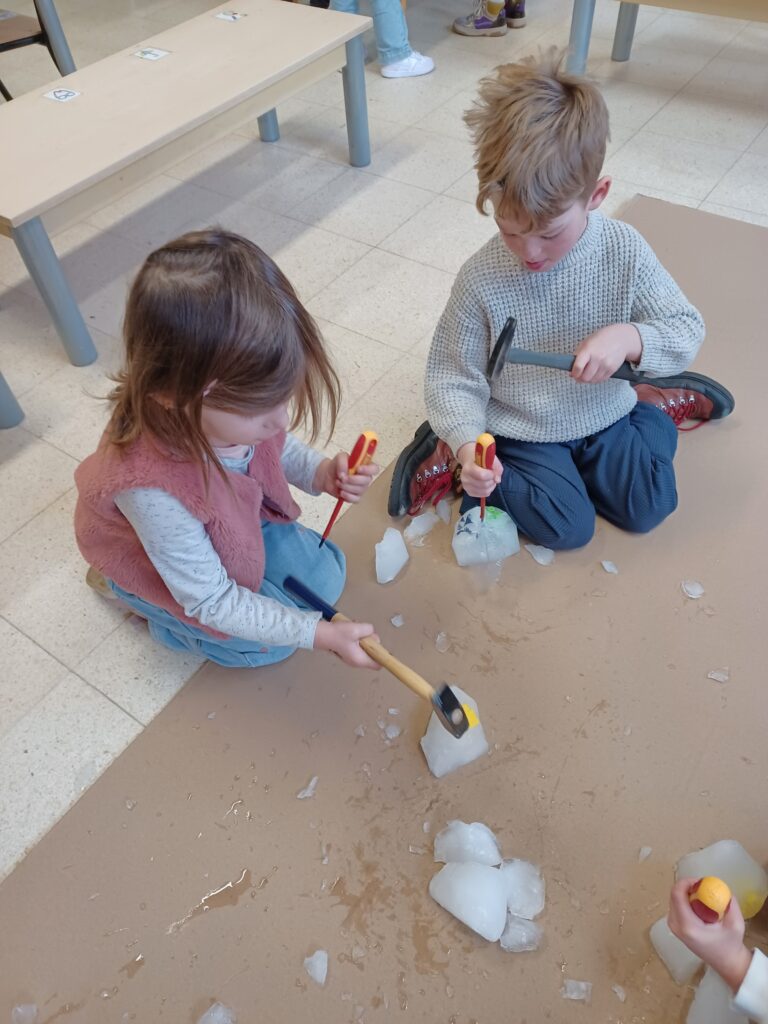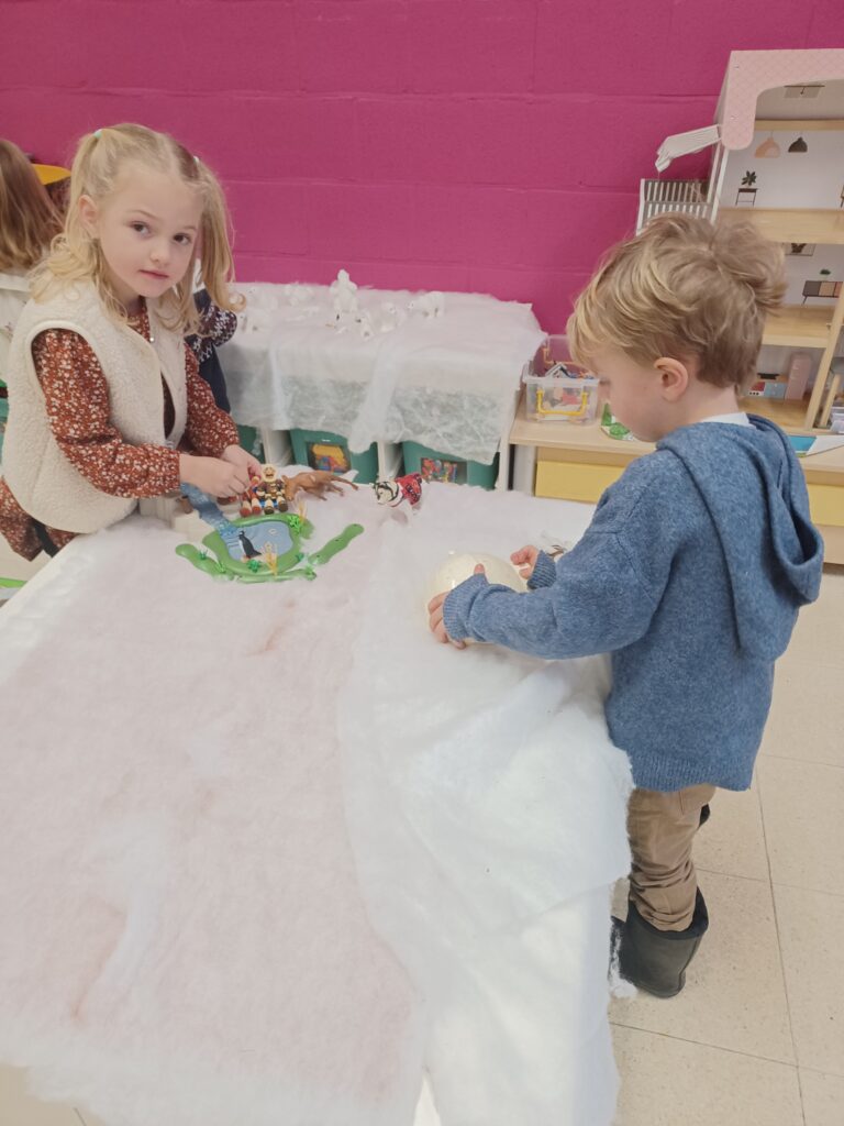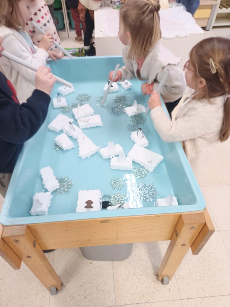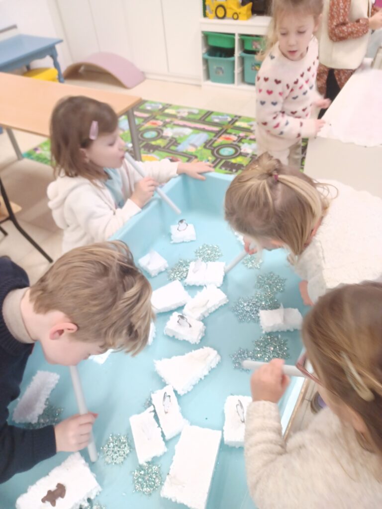 We knutselden, speelden spelletjes, gaven de pinguïn eten, we visten met magneten, we speelden met zelfgemaakte sneeuw, we experimenteerden met ijs, deden aan ijskappen, we mochten op de skilatten staan en sleeën in de gang. Kortom we hadden veel plezier.