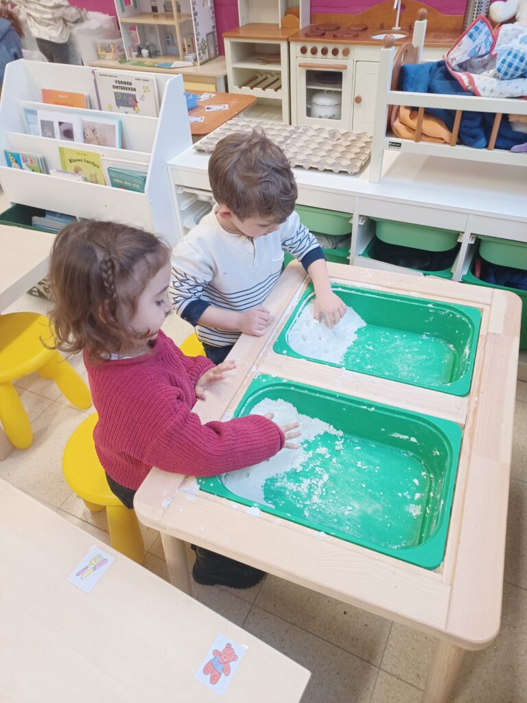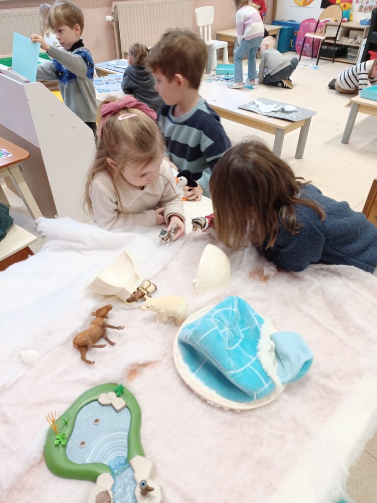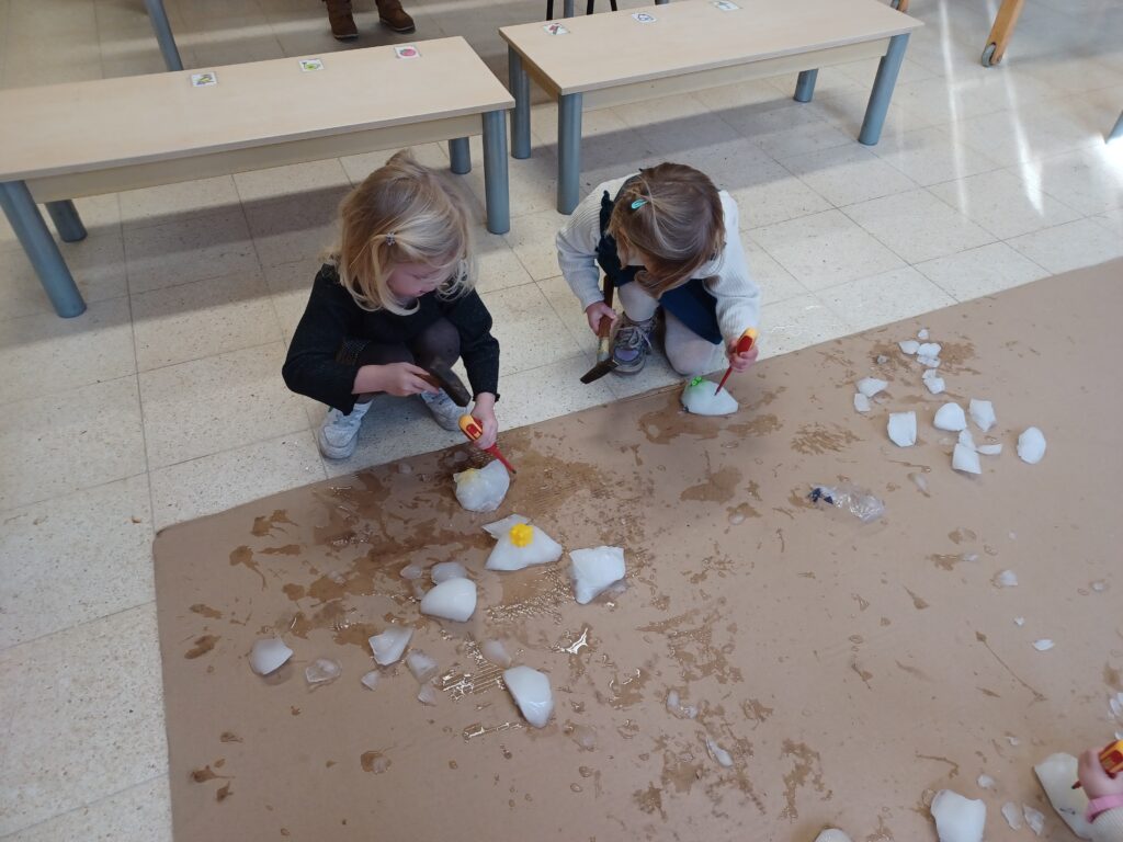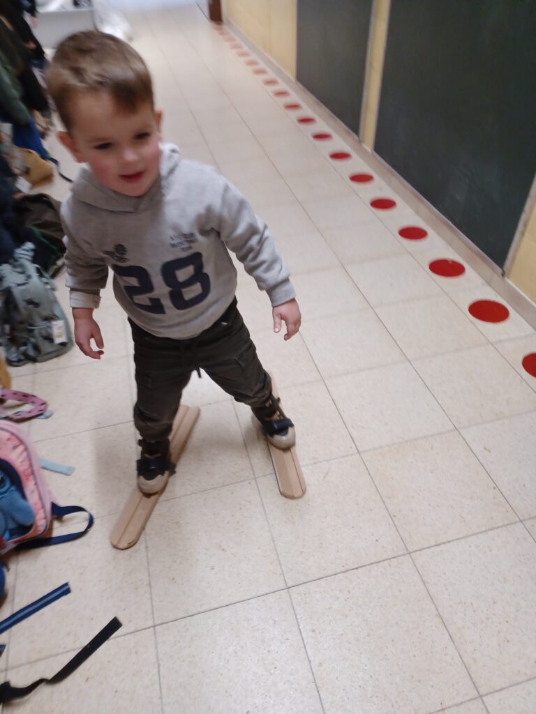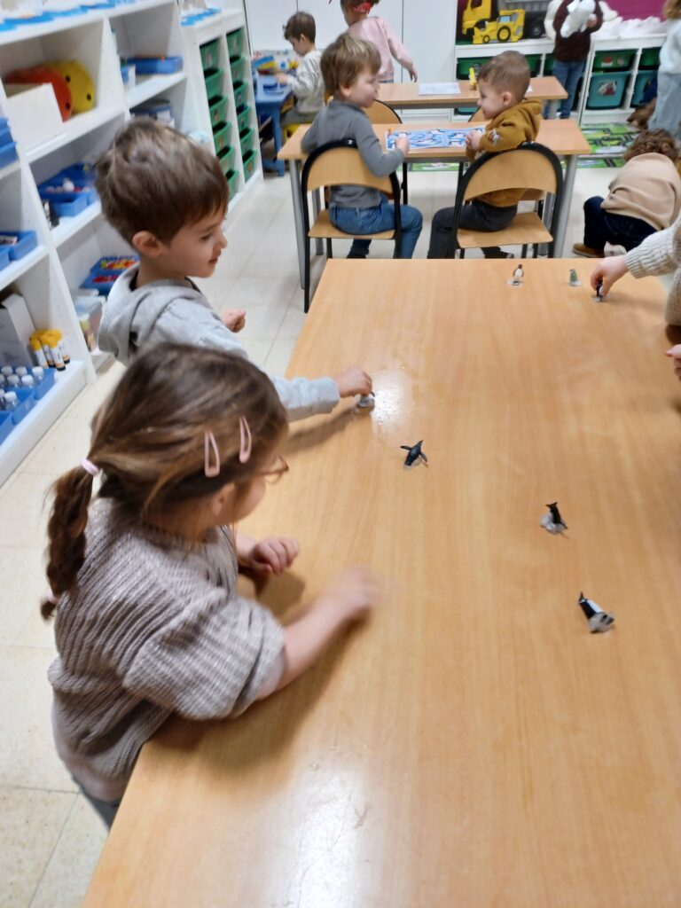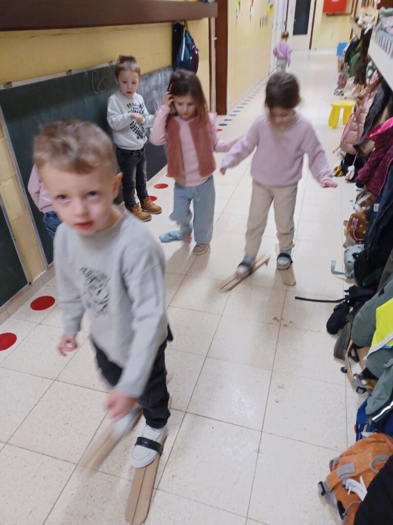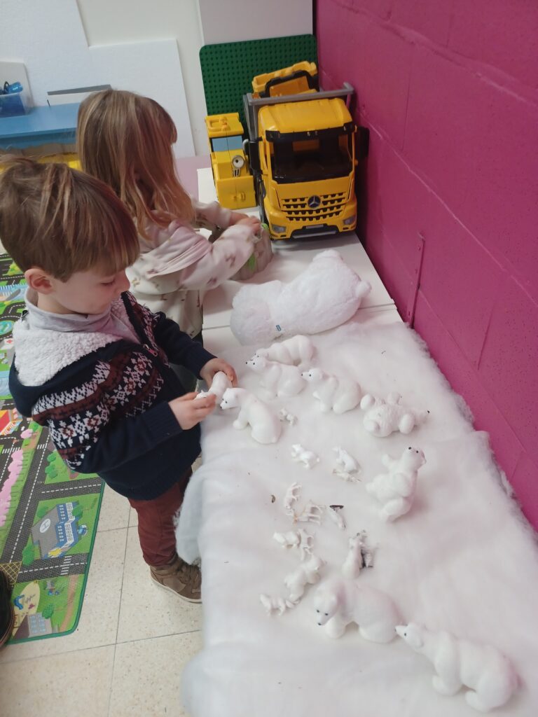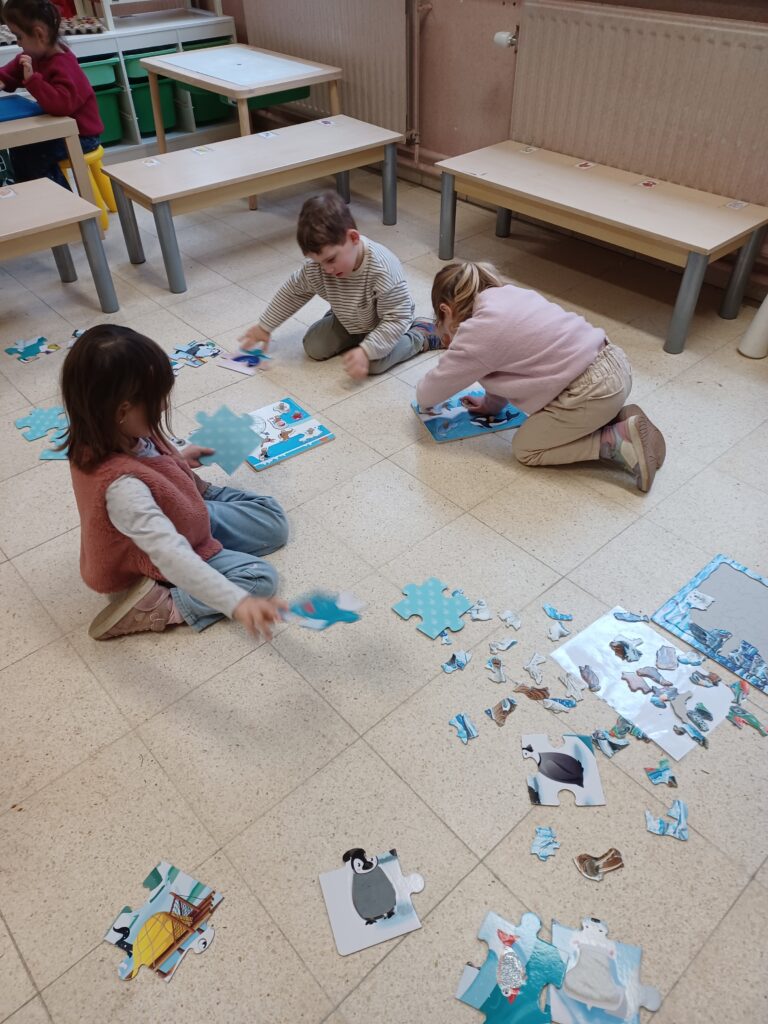 We knutselden, speelden spelletjes, gaven de pinguïn eten, we visten met magneten, we speelden met zelfgemaakte sneeuw, we experimenteerden met ijs, deden aan ijskappen, we mochten op de skilatten staan en sleeën in de gang. Kortom we hadden veel plezier.