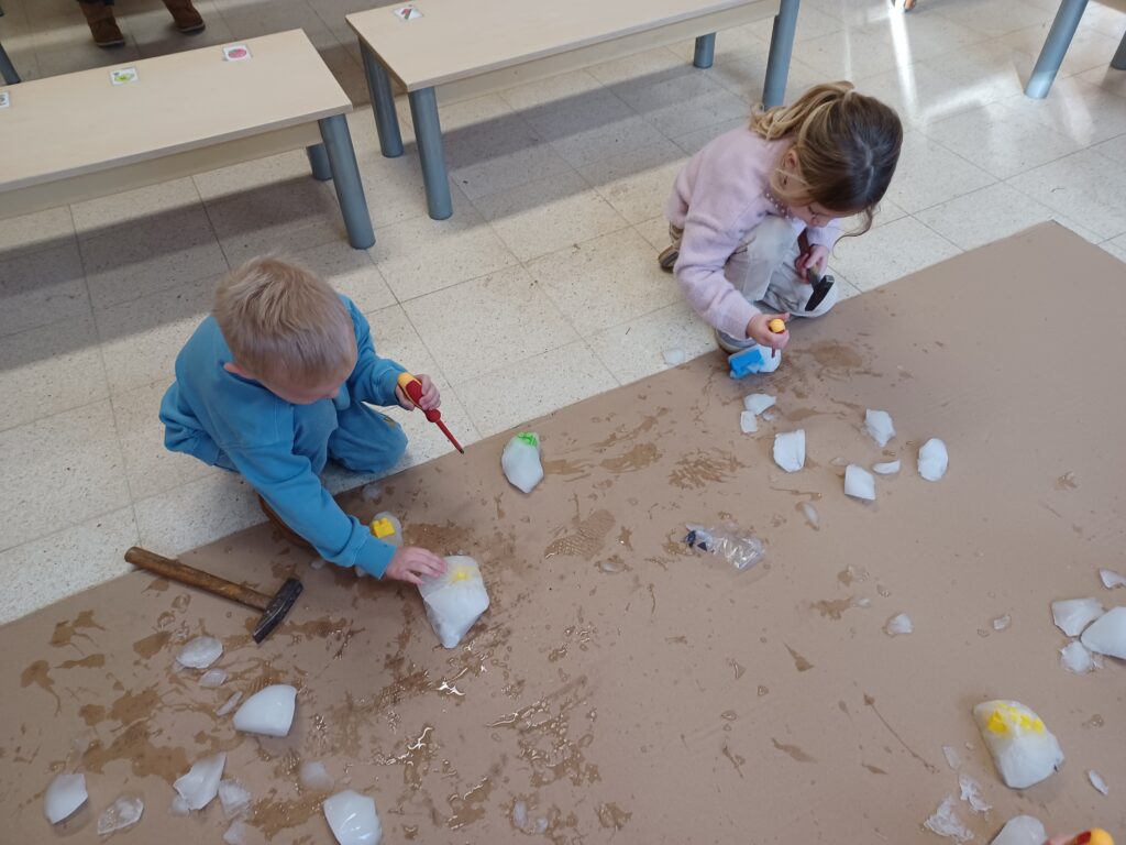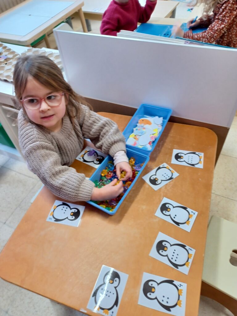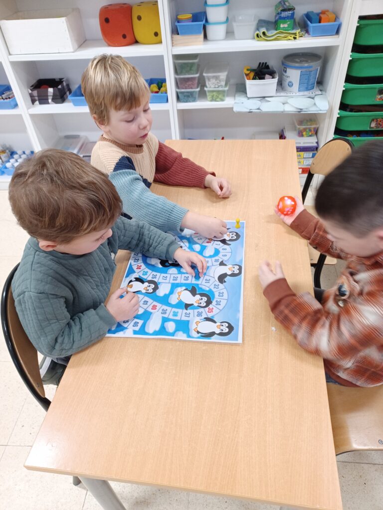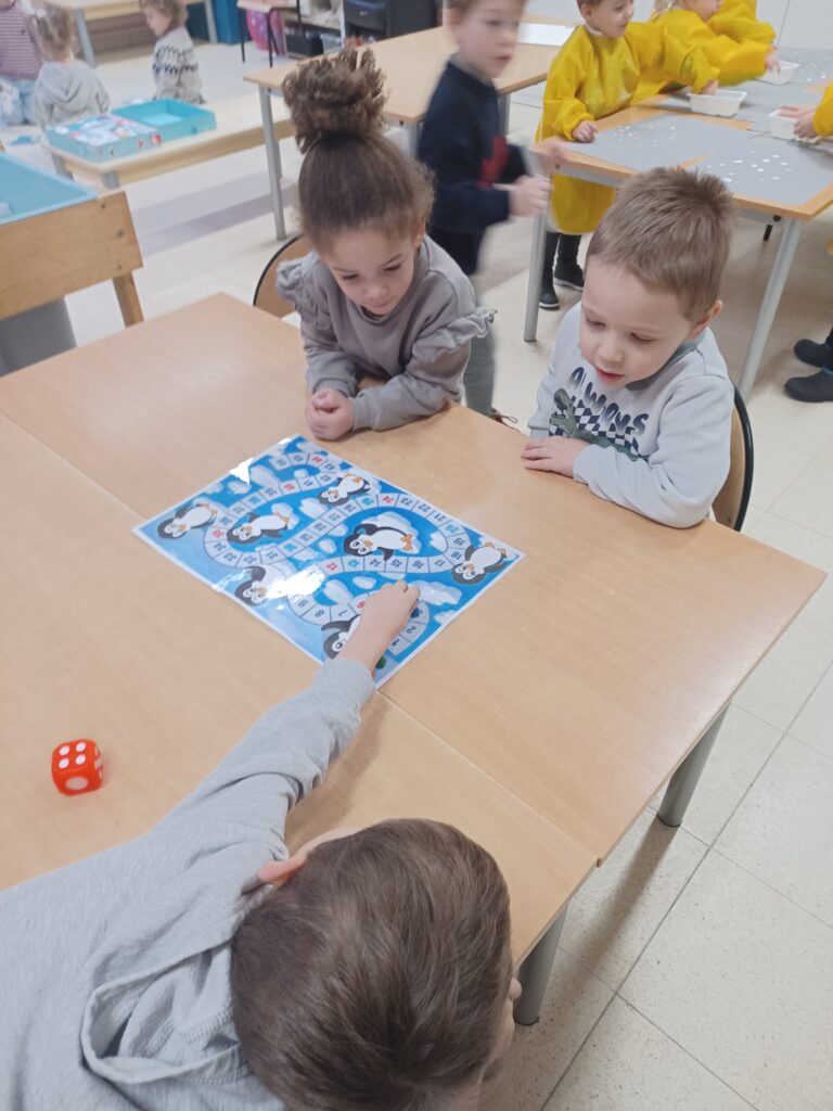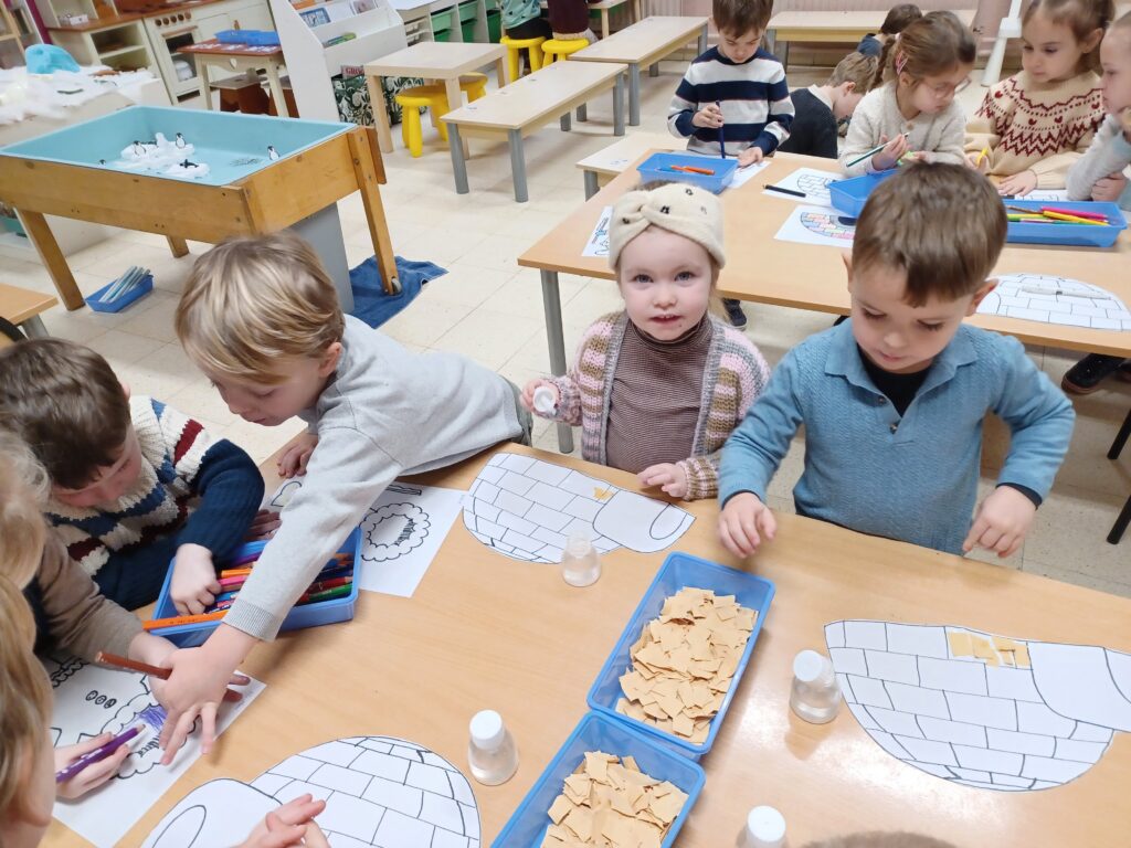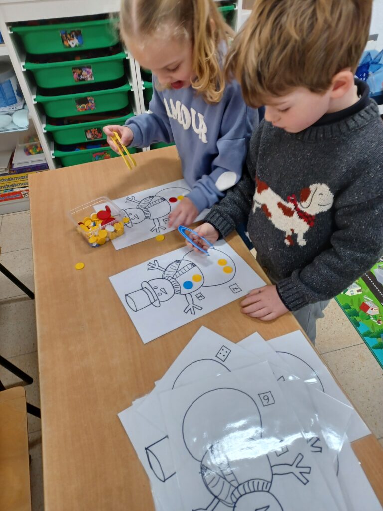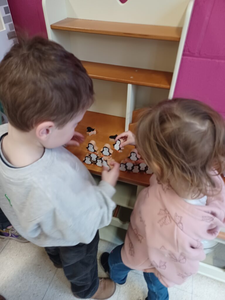 We knutselden, speelden spelletjes, gaven de pinguïn eten, we visten met magneten, we speelden met zelfgemaakte sneeuw, we experimenteerden met ijs, deden aan ijskappen, we mochten op de skilatten staan en sleeën in de gang. Kortom we hadden veel plezier.