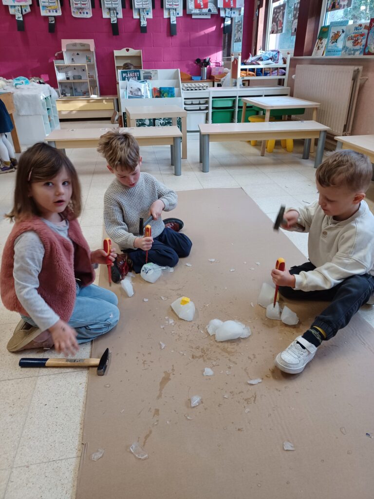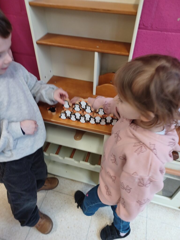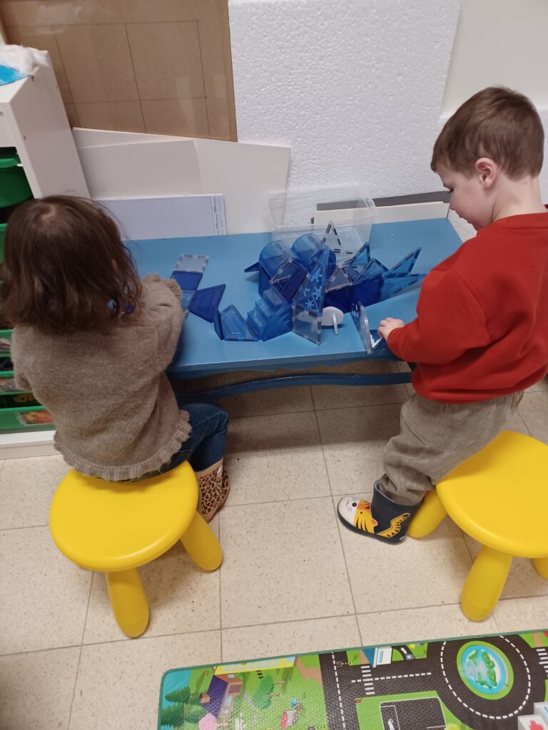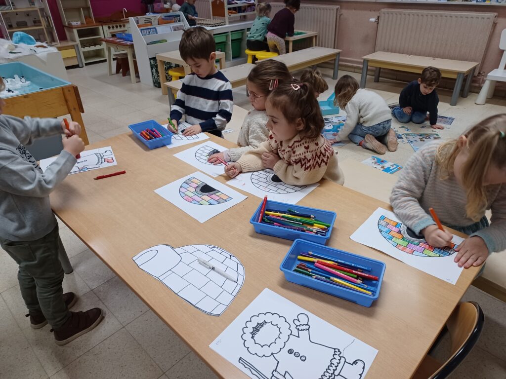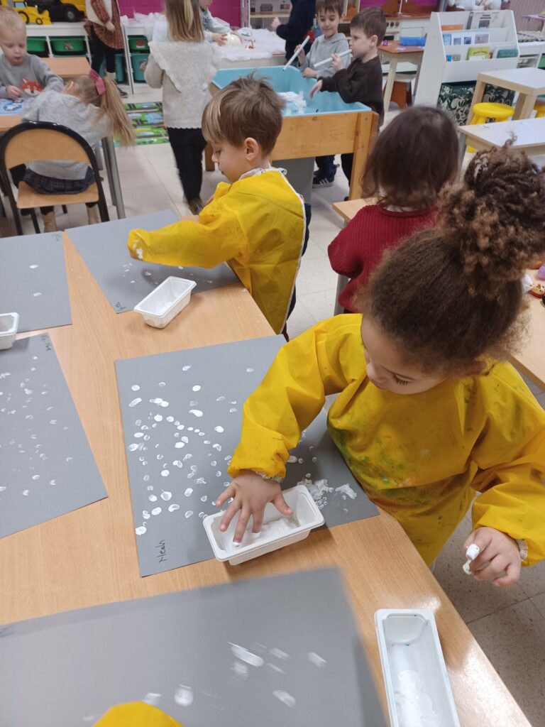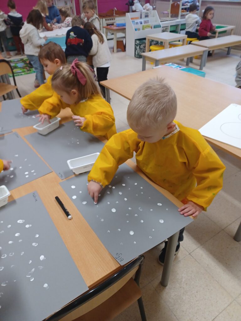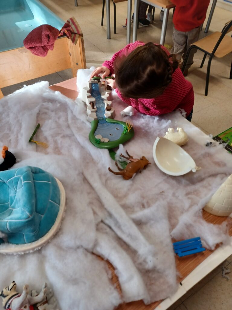 We knutselden, speelden spelletjes, gaven de pinguïn eten, we visten met magneten, we speelden met zelfgemaakte sneeuw, we experimenteerden met ijs, deden aan ijskappen, we mochten op de skilatten staan en sleeën in de gang. Kortom we hadden veel plezier.