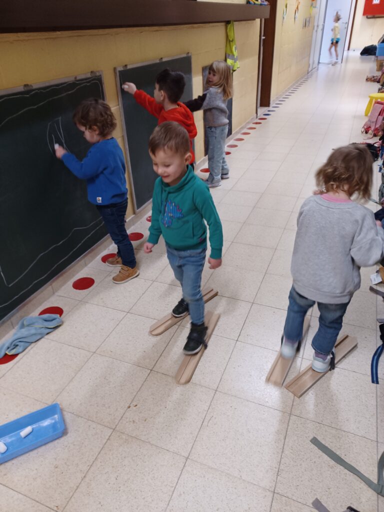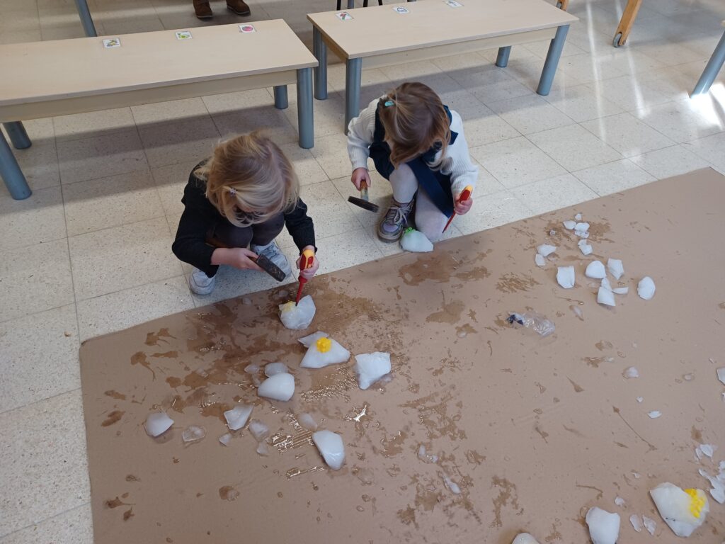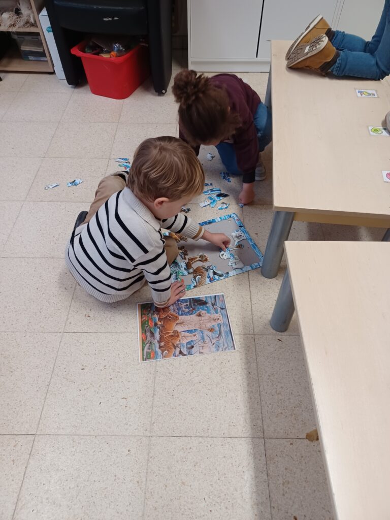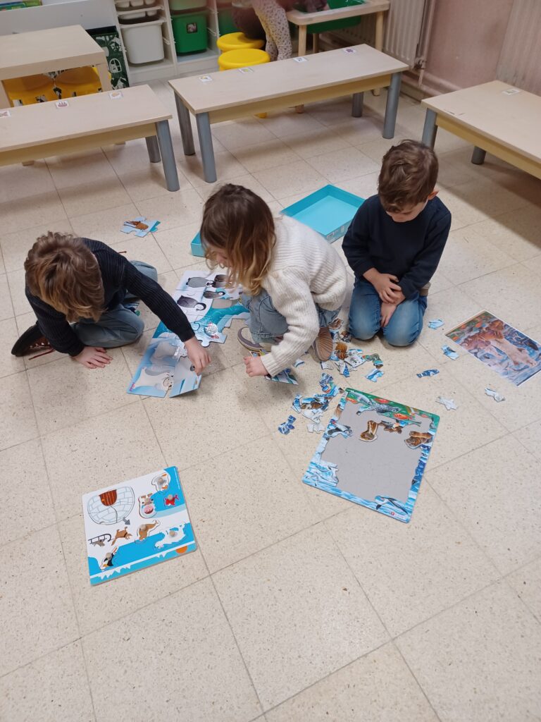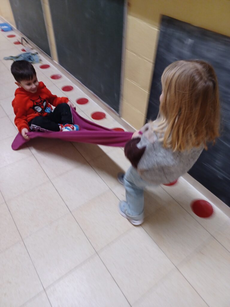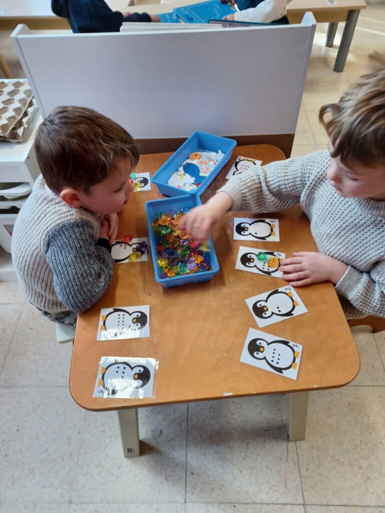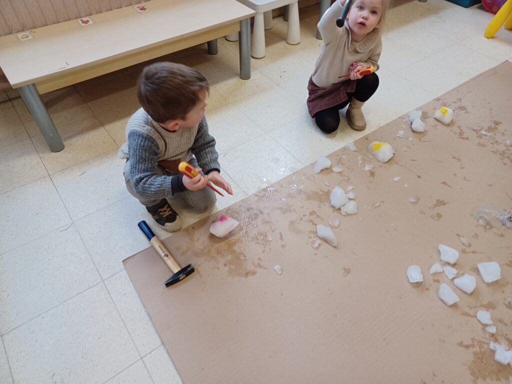 We knutselden, speelden spelletjes, gaven de pinguïn eten, we visten met magneten, we speelden met zelfgemaakte sneeuw, we experimenteerden met ijs, deden aan ijskappen, we mochten op de skilatten staan en sleeën in de gang. Kortom we hadden veel plezier.