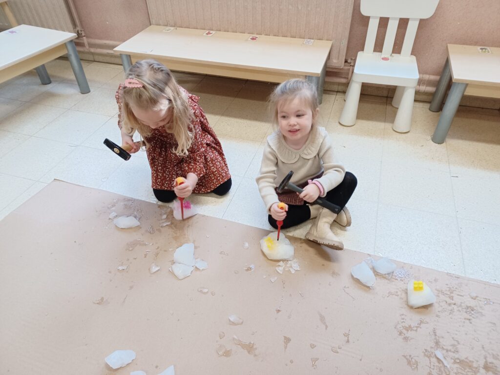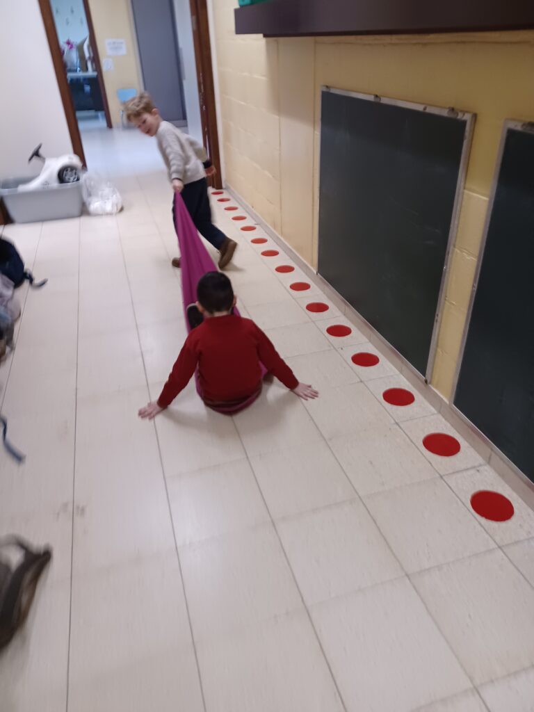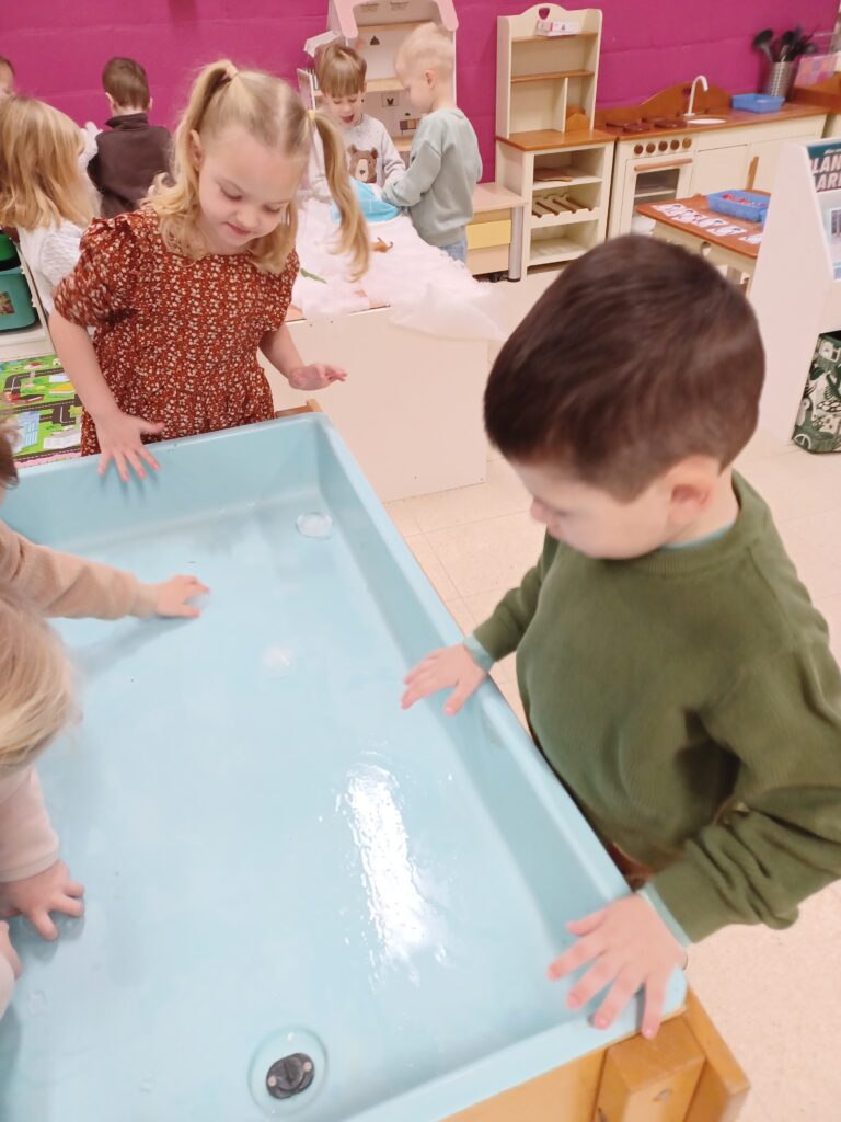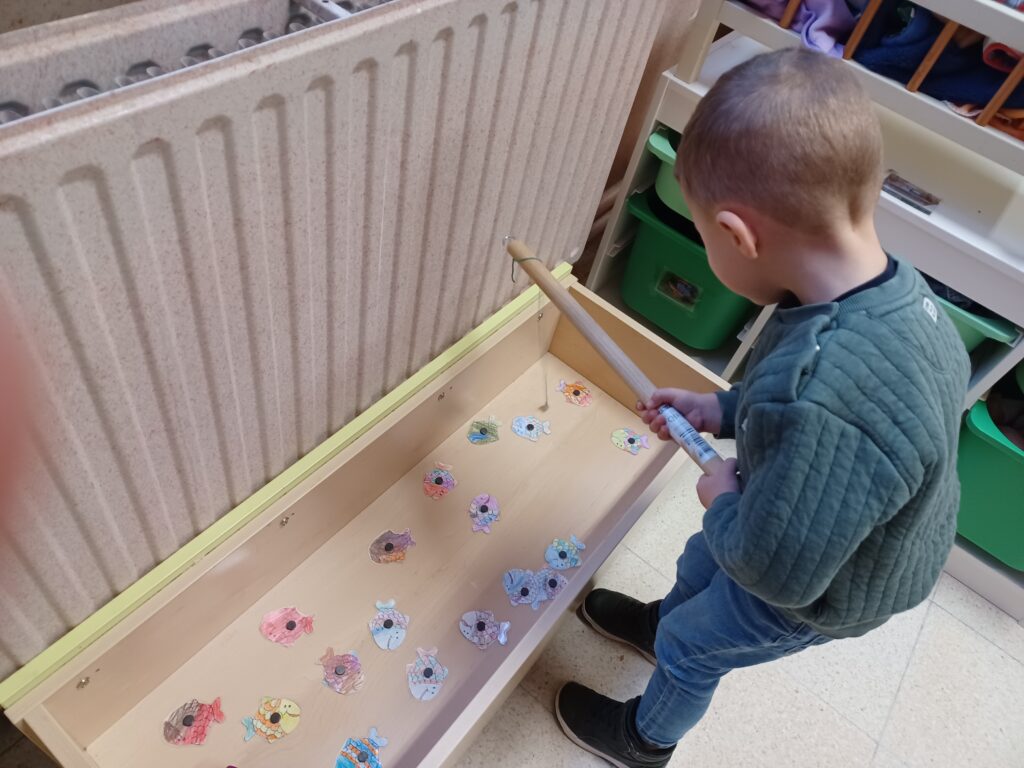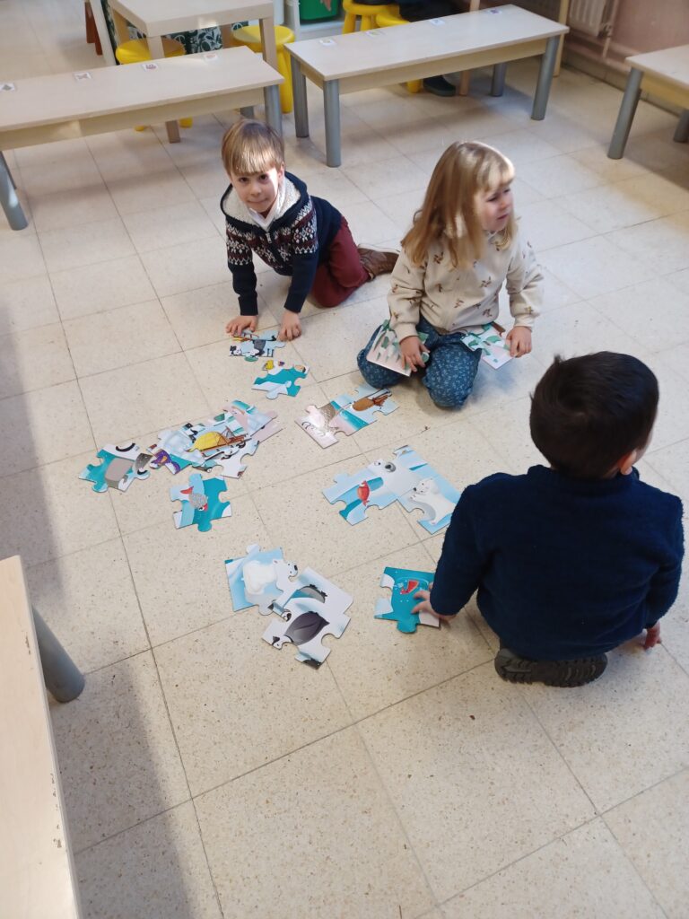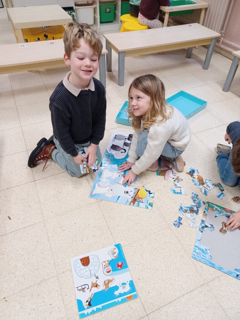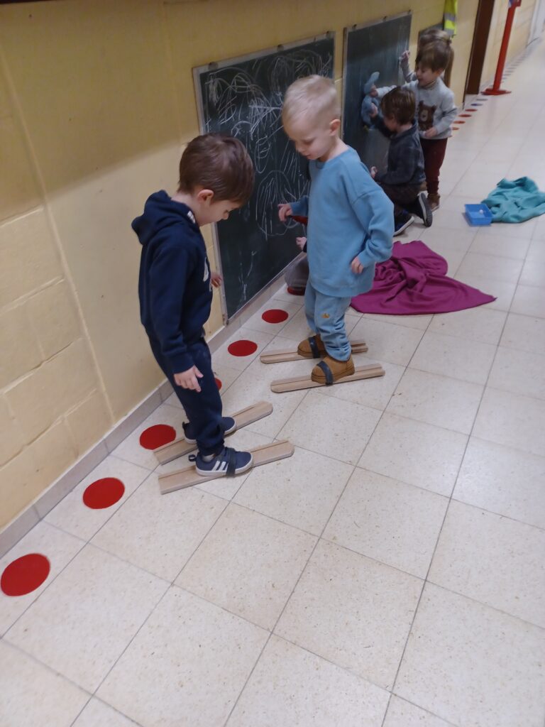 We knutselden, speelden spelletjes, gaven de pinguïn eten, we visten met magneten, we speelden met zelfgemaakte sneeuw, we experimenteerden met ijs, deden aan ijskappen, we mochten op de skilatten staan en sleeën in de gang. Kortom we hadden veel plezier.