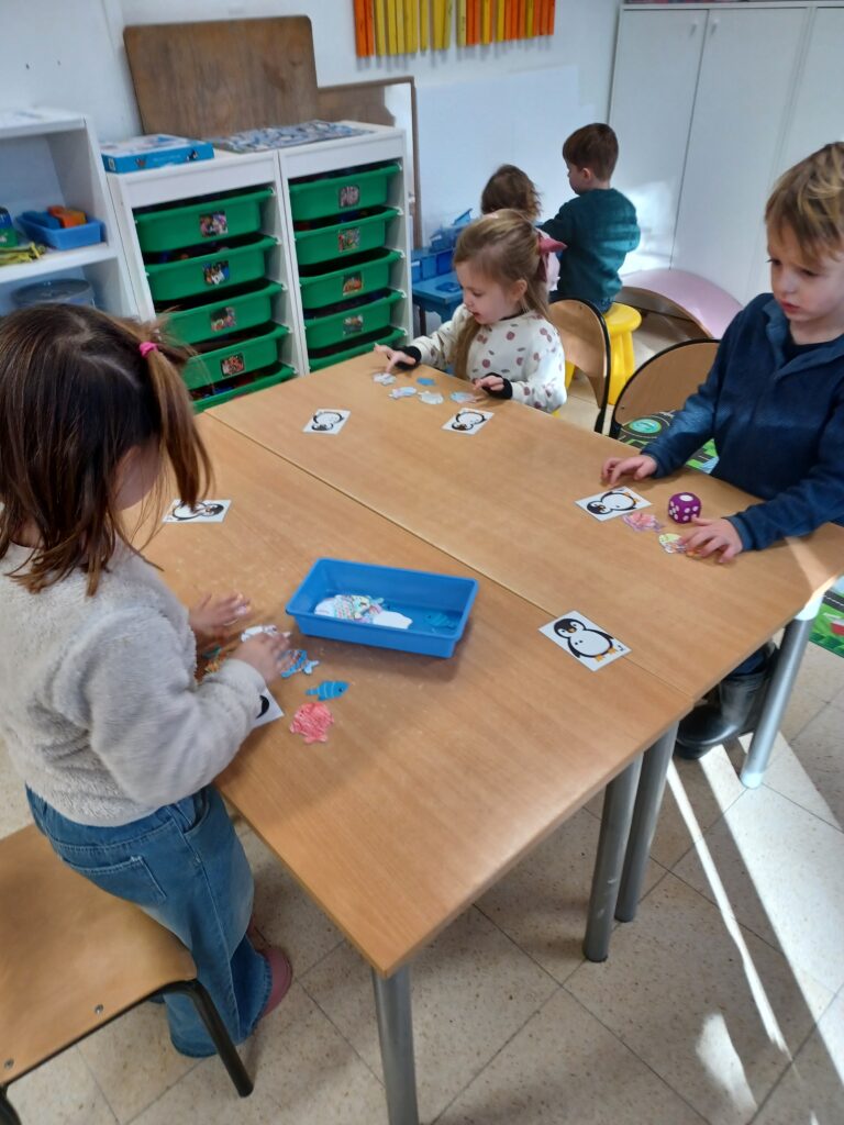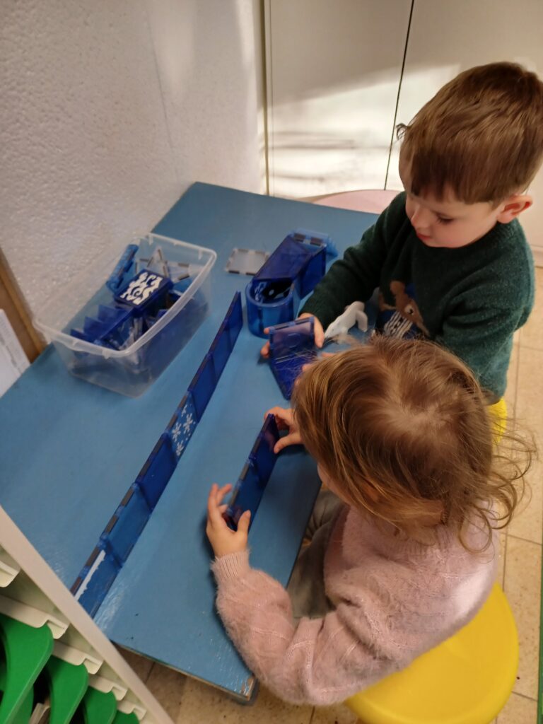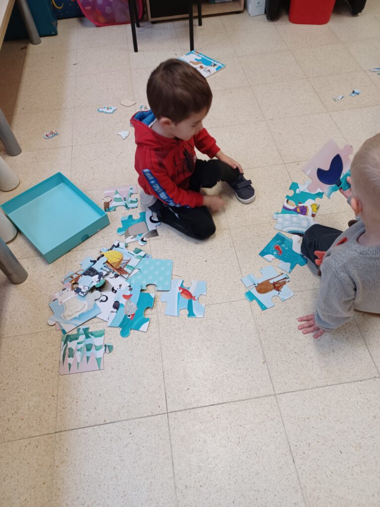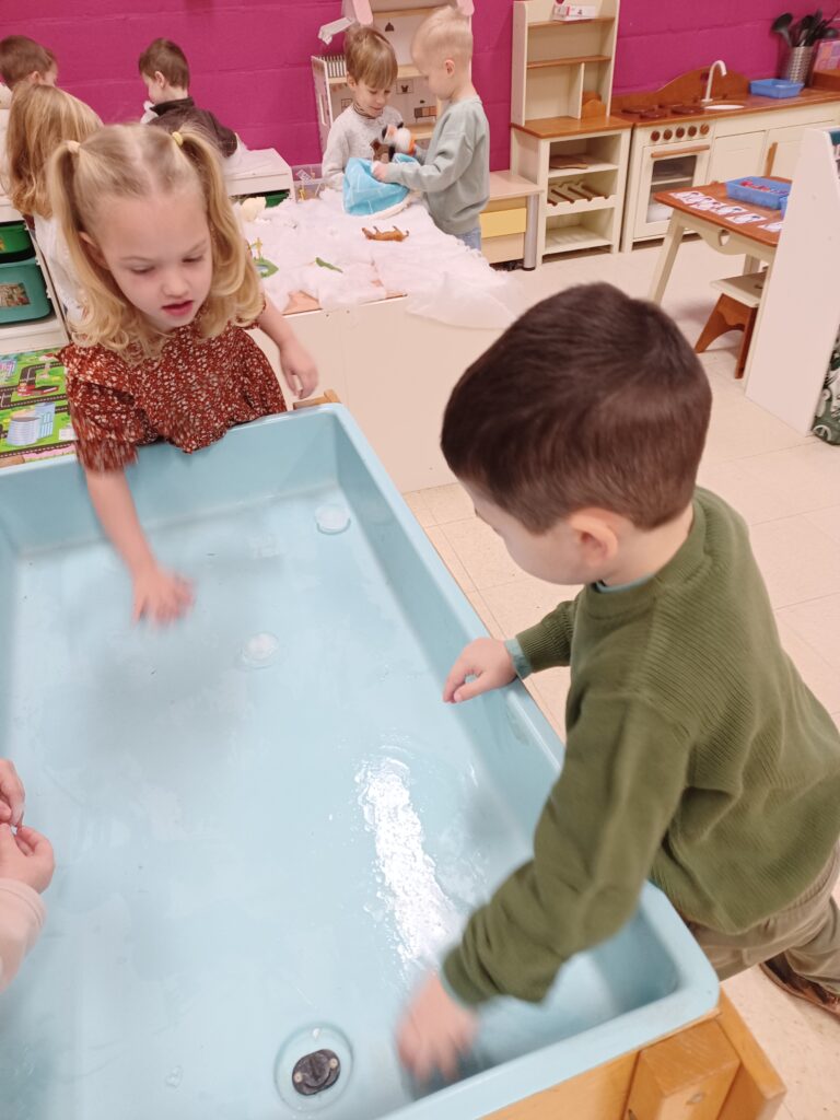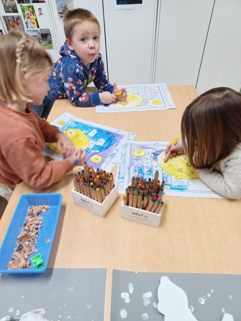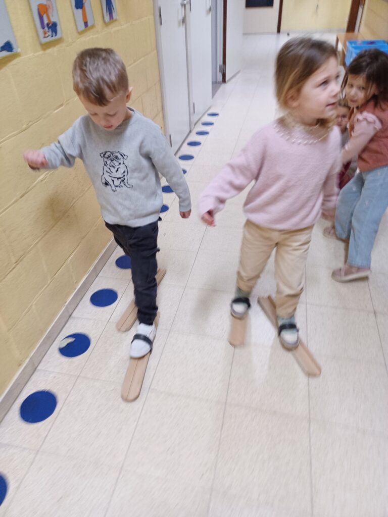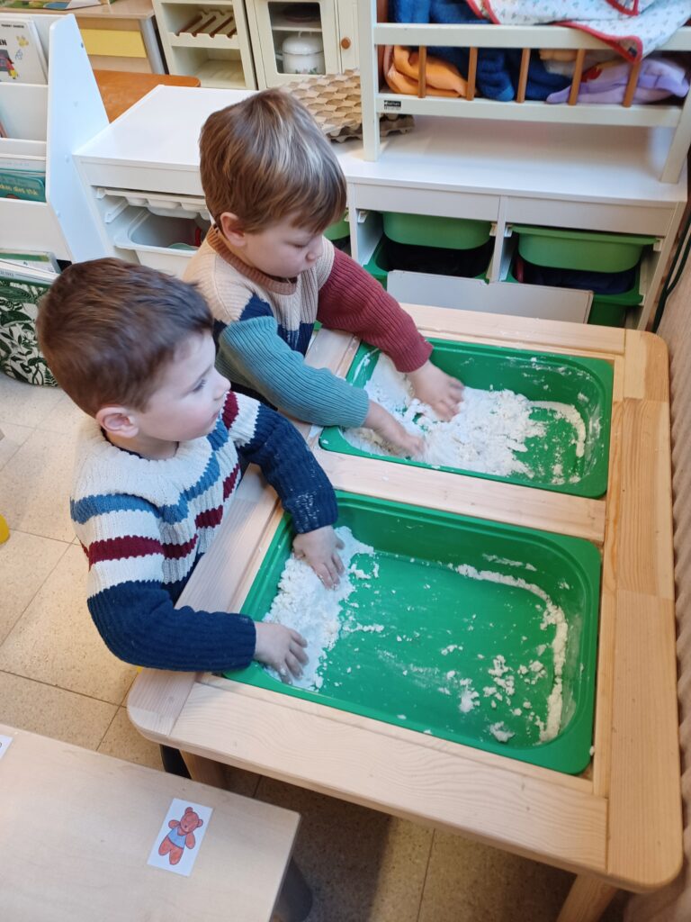 We knutselden, speelden spelletjes, gaven de pinguïn eten, we visten met magneten, we speelden met zelfgemaakte sneeuw, we experimenteerden met ijs, deden aan ijskappen, we mochten op de skilatten staan en sleeën in de gang. Kortom we hadden veel plezier.