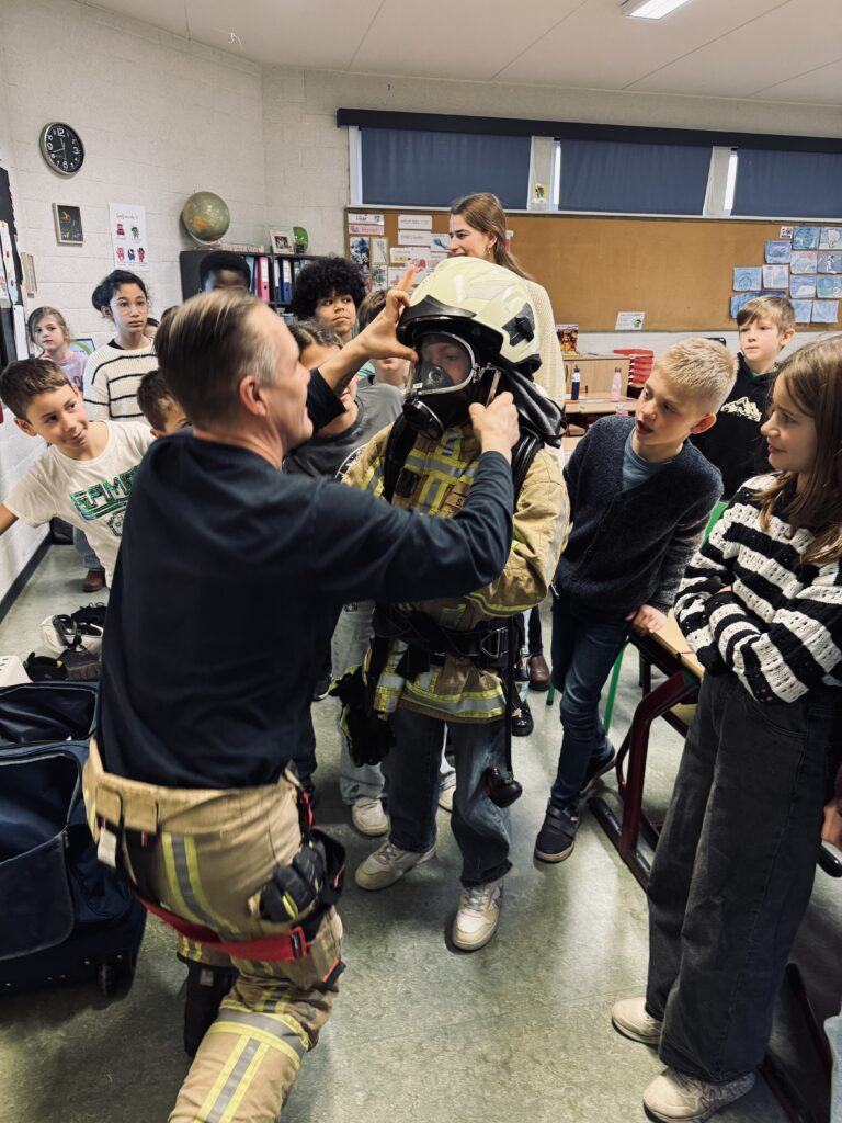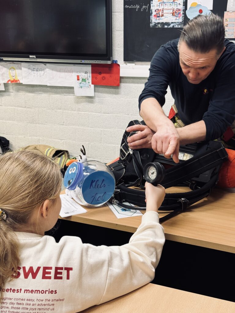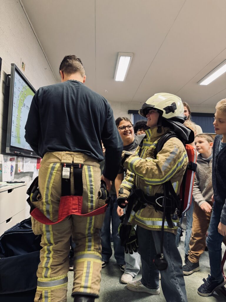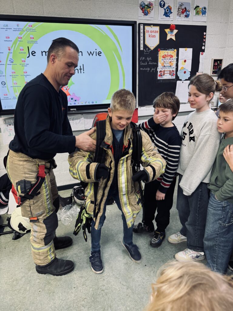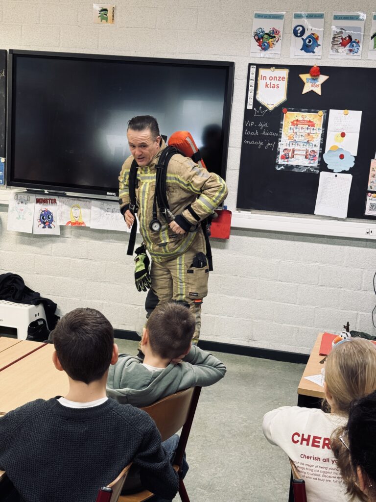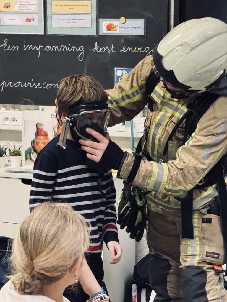 Vandaag kwam brandweerman Steven in de klas. We mochten het zware pak aantrekken, het zuurstofmasker opzetten en heel veel vragen stellen.