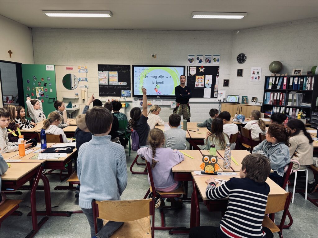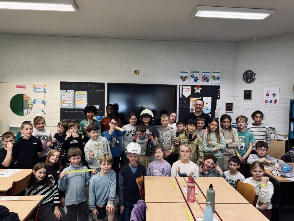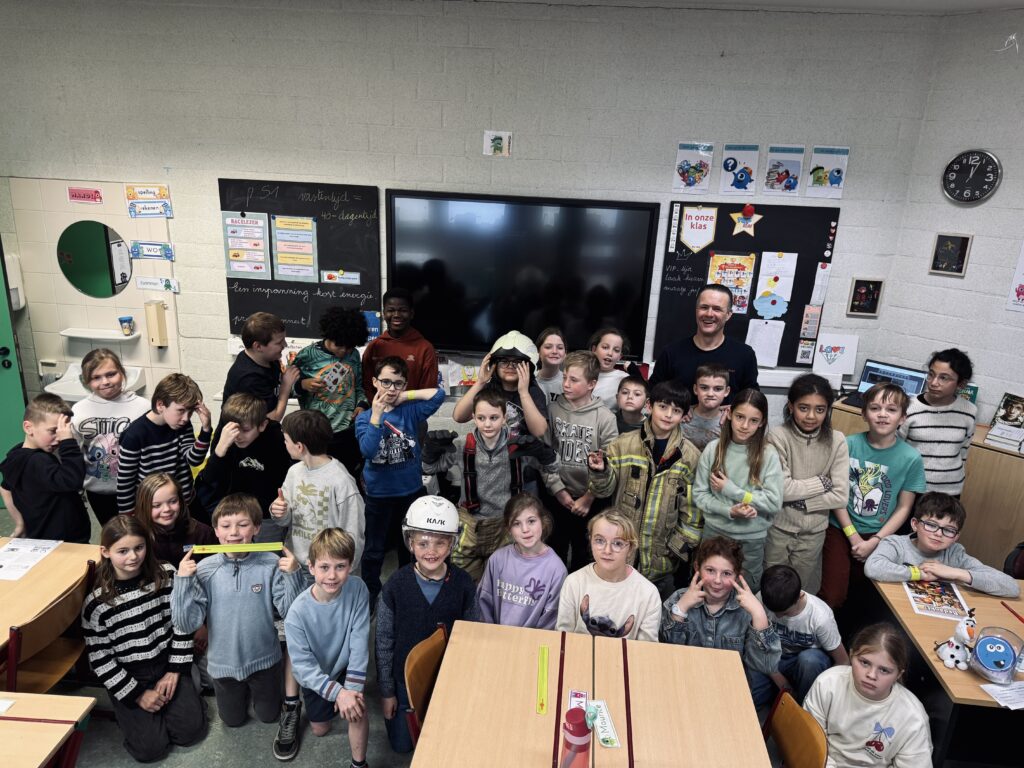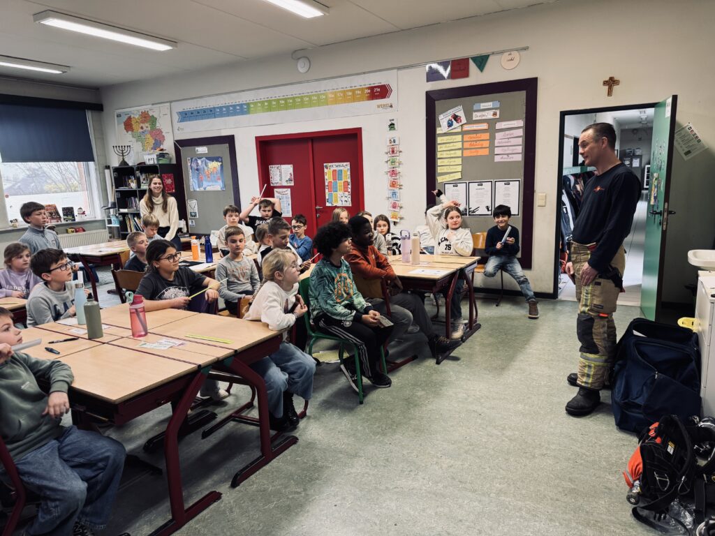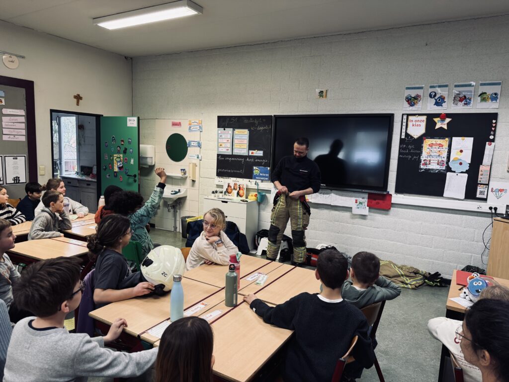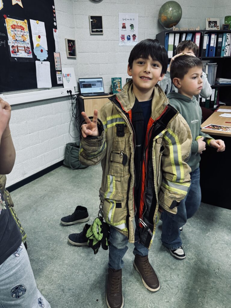 Vandaag kwam brandweerman Steven in de klas. We mochten het zware pak aantrekken, het zuurstofmasker opzetten en heel veel vragen stellen.