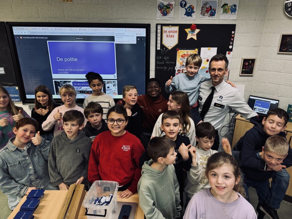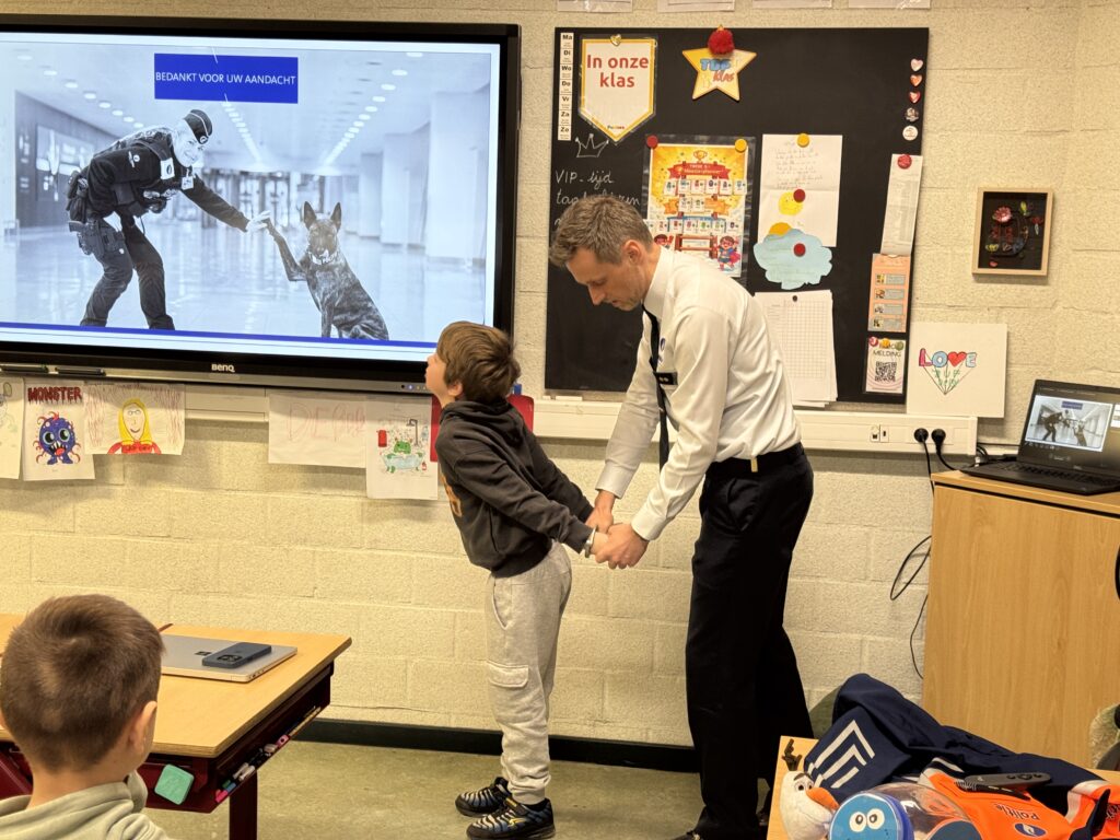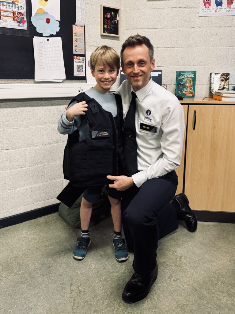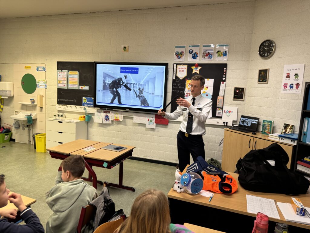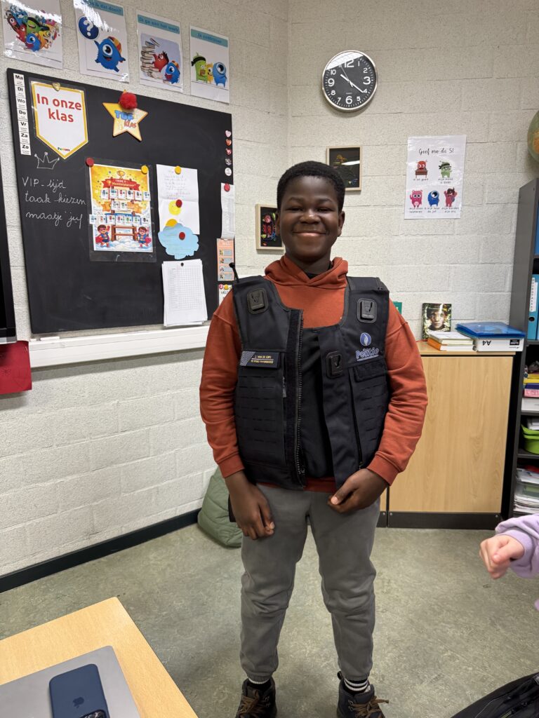 Vandaag kwam politiecommissaris Joachim in de klas. Hij gaf veel uitleg over werken bij de politie en gaf ook tips mee om veilig te gamen!