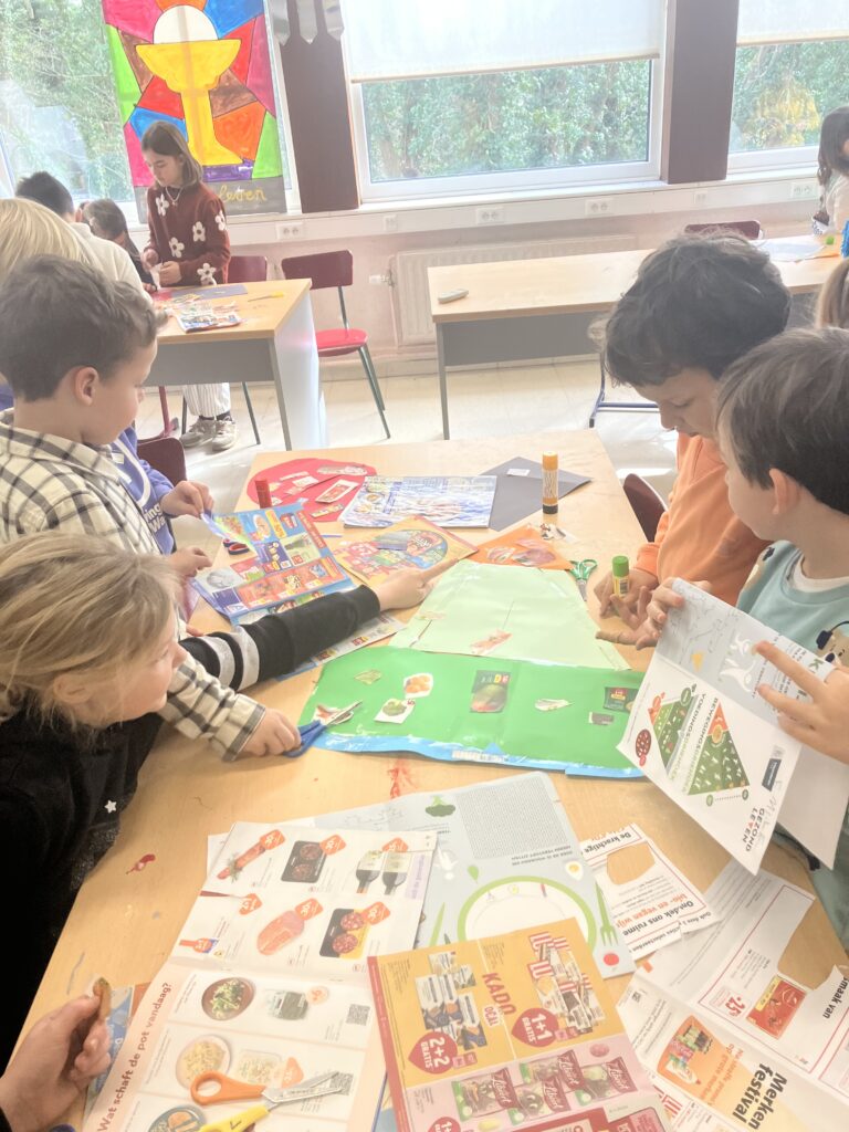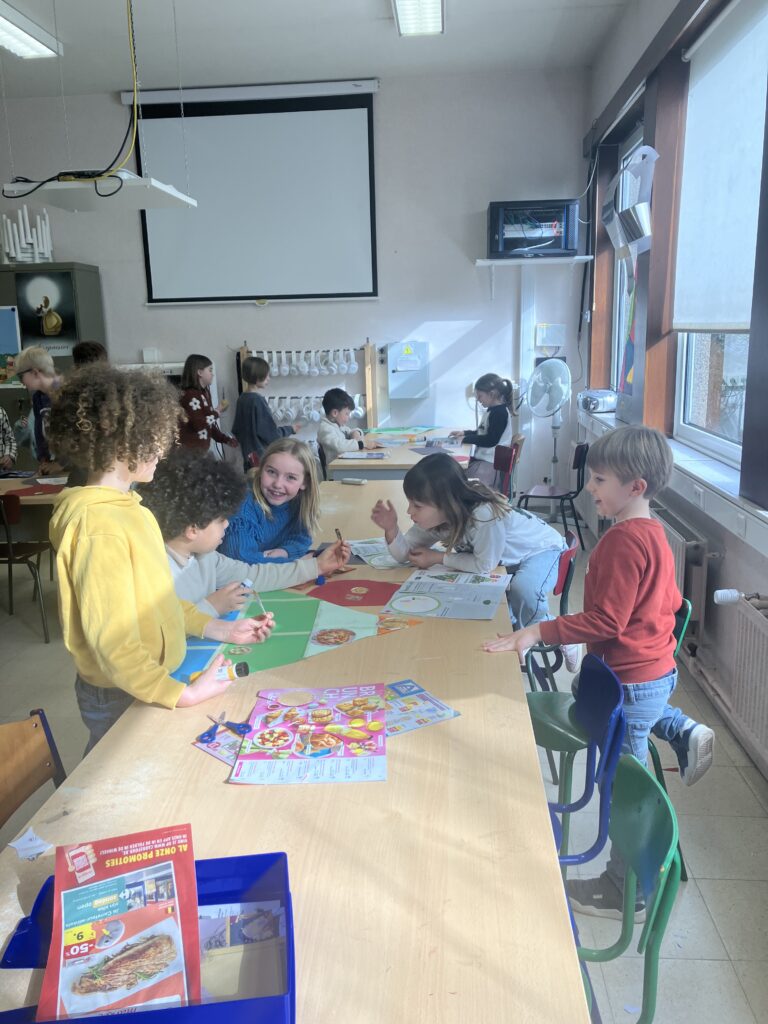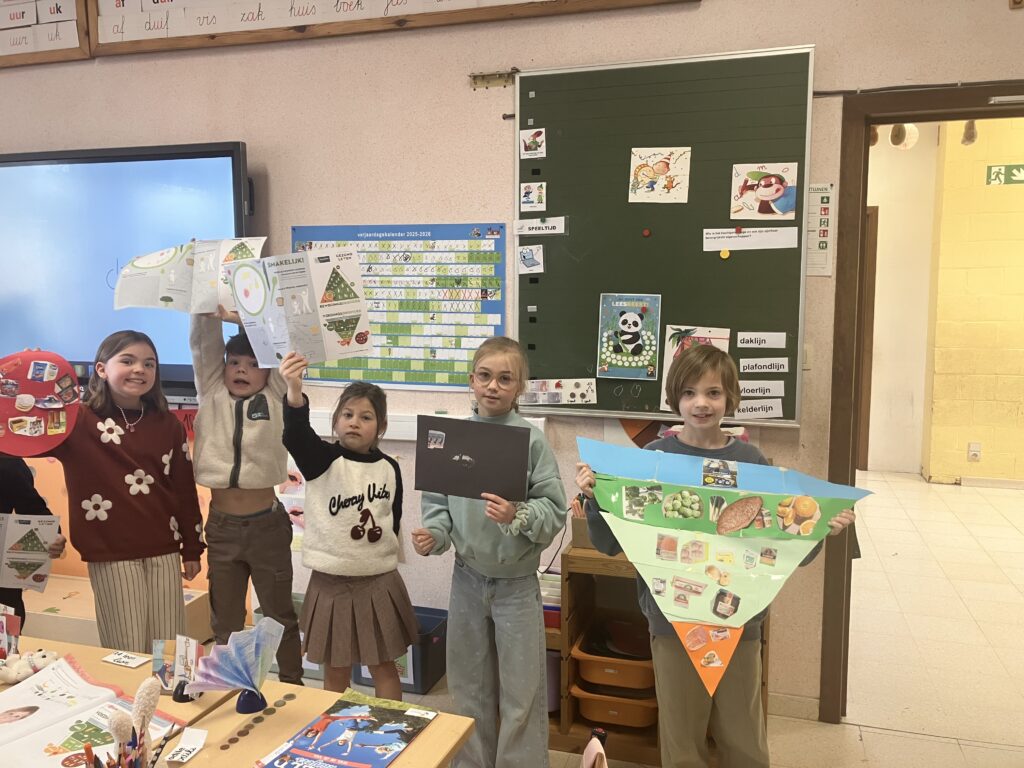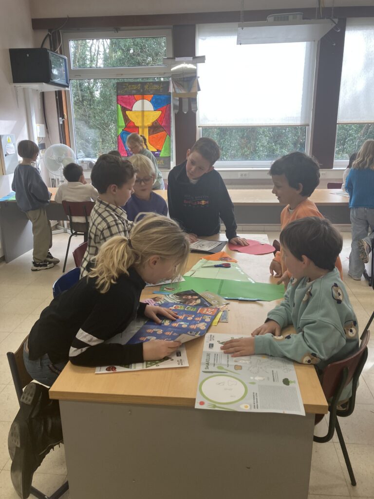 Tijdens de lessen wereldoriëntatie leerden het 1ste en het 3de leerjaar over gezonde voeding en de voedingsdriehoek. De leerlingen van het derde leerjaar knutselden een voedingsdriehoek en gingen daarna samen met het eerste leerjaar aan de slag. Samen zochten ze voedingsmiddelen in reclamefolders en kleefden die op de juiste plaats.