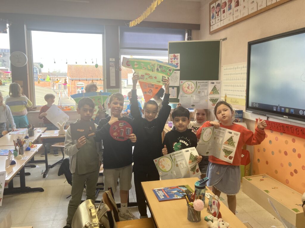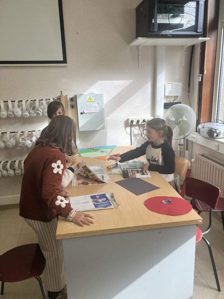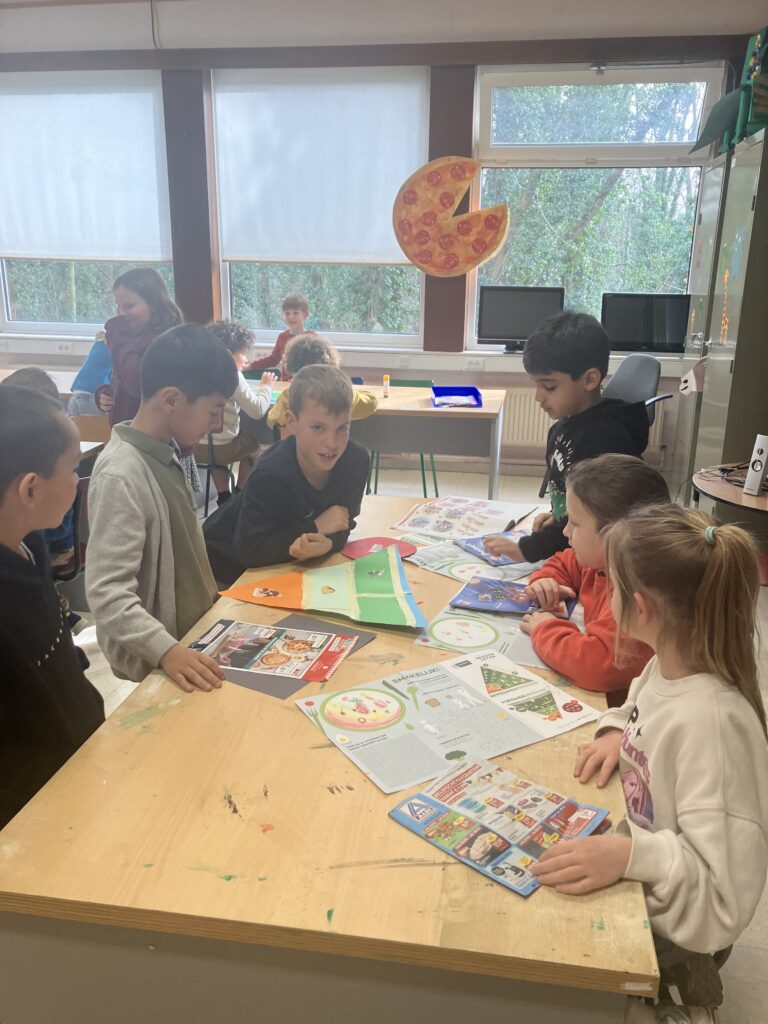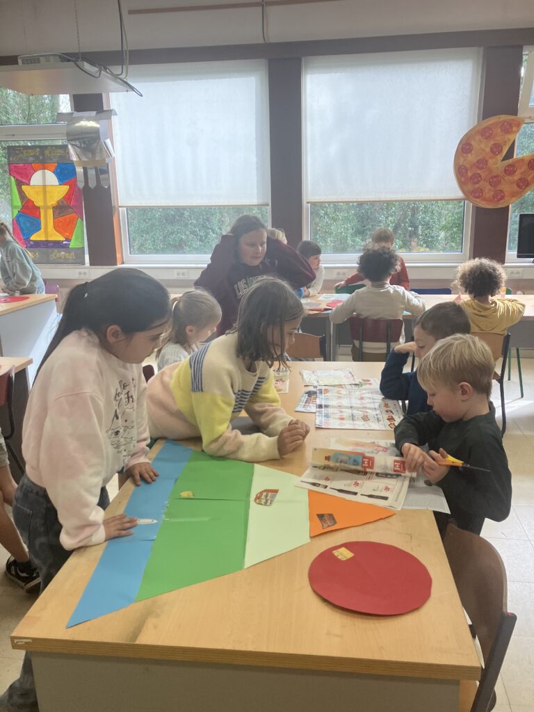 Tijdens de lessen wereldoriëntatie leerden het 1ste en het 3de leerjaar over gezonde voeding en de voedingsdriehoek. De leerlingen van het derde leerjaar knutselden een voedingsdriehoek en gingen daarna samen met het eerste leerjaar aan de slag. Samen zochten ze voedingsmiddelen in reclamefolders en kleefden die op de juiste plaats.