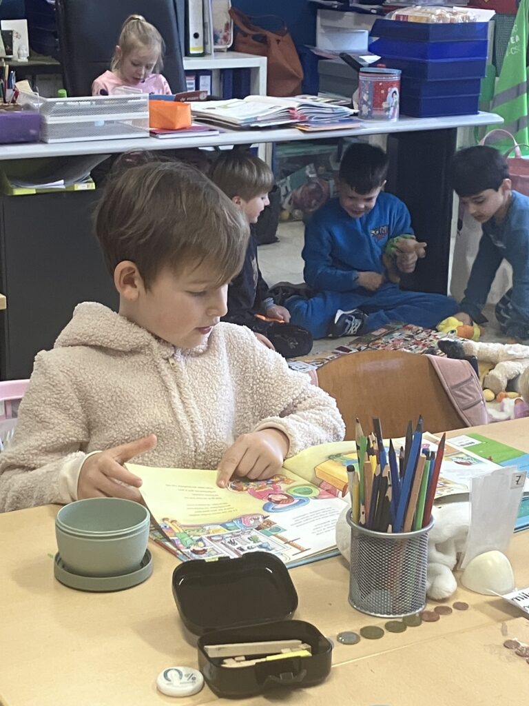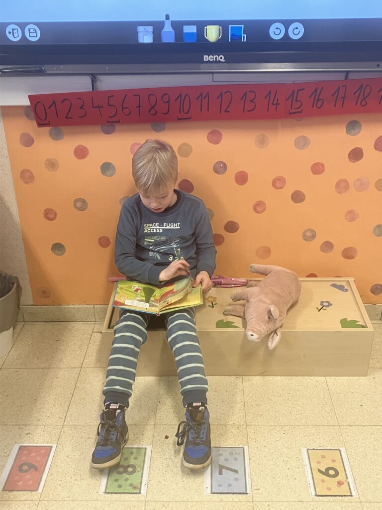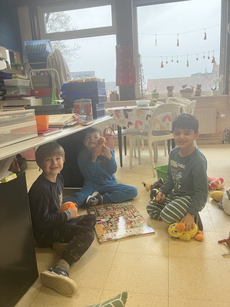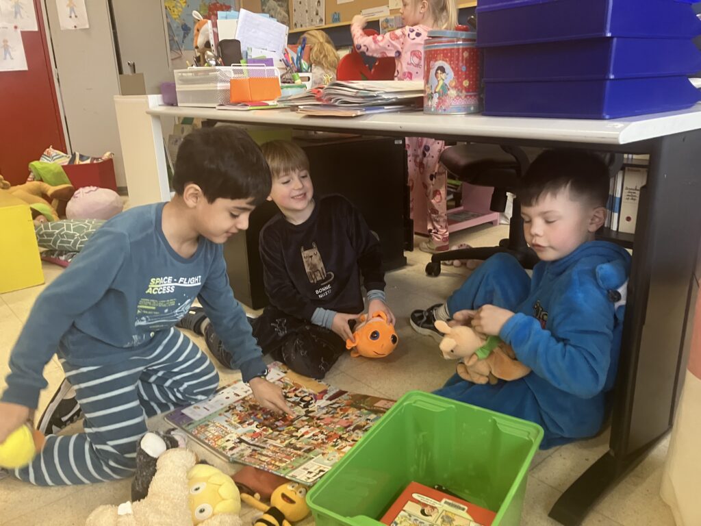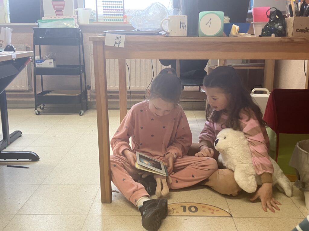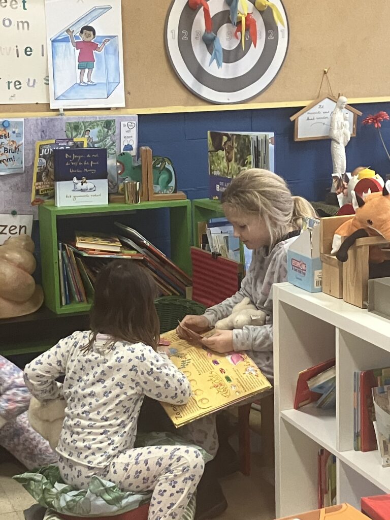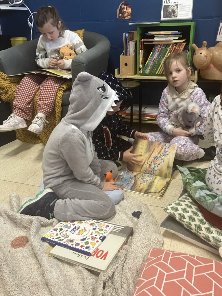 In hun pyjama maakten de leerlingen het extra gezellig in de klas. Uit de mand mochten ze een dierenknuffel kiezen. Met hun knuffel erbij genoten ze van een rustig moment plezierlezen.