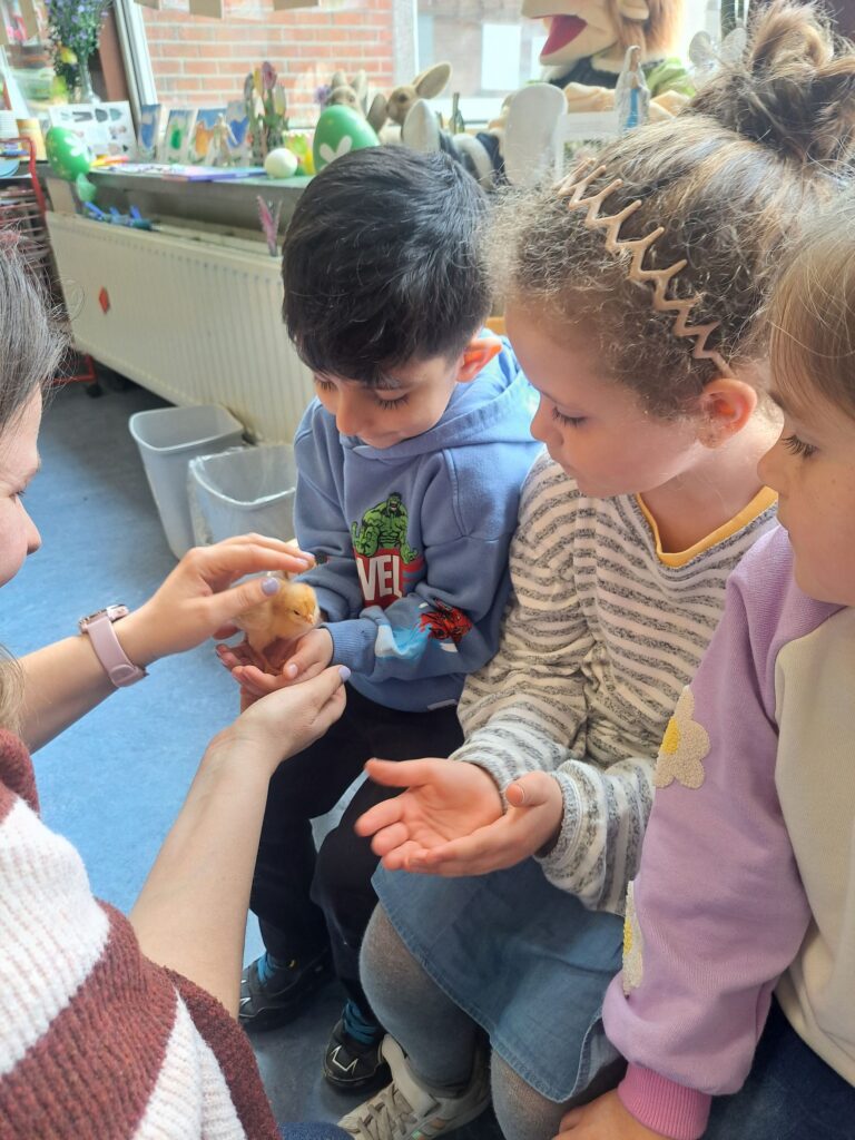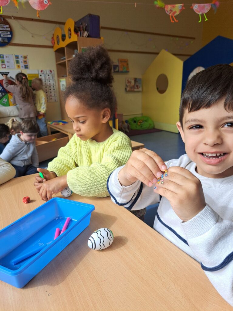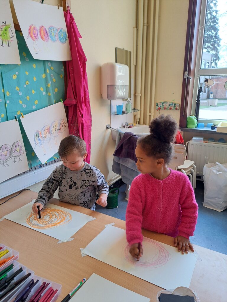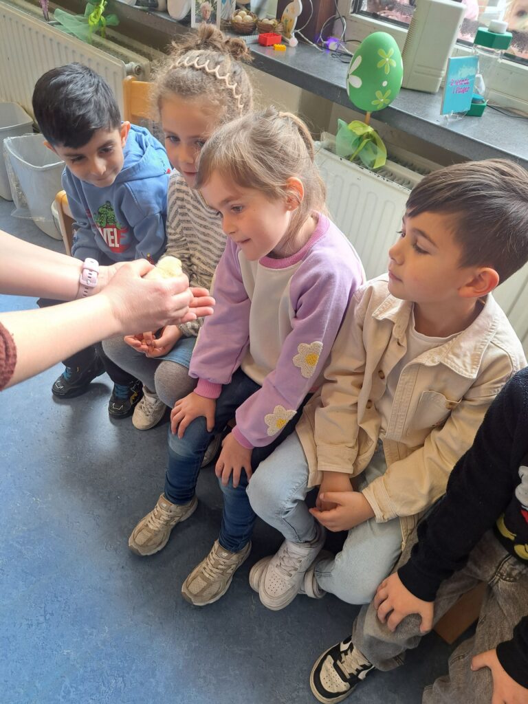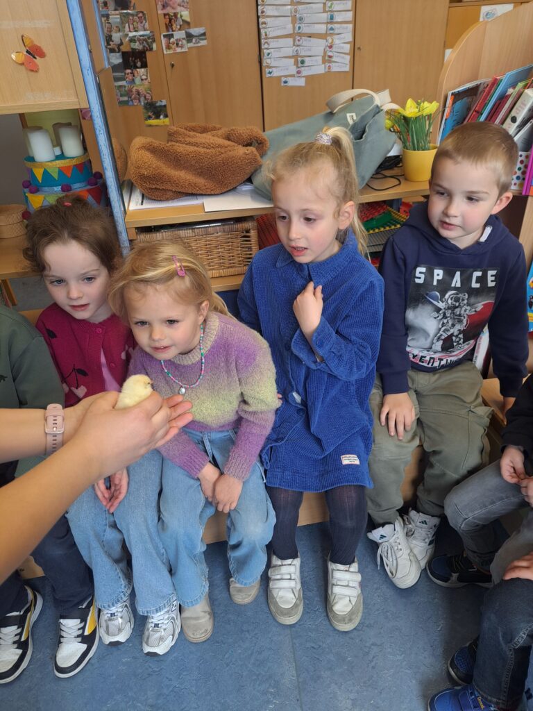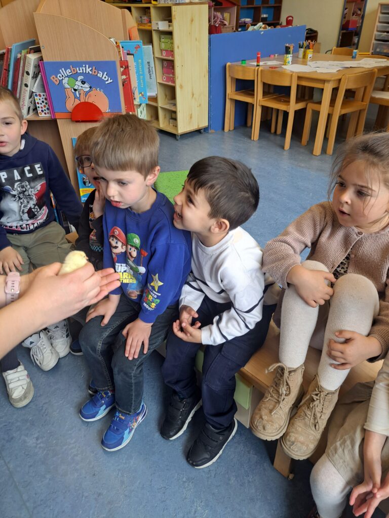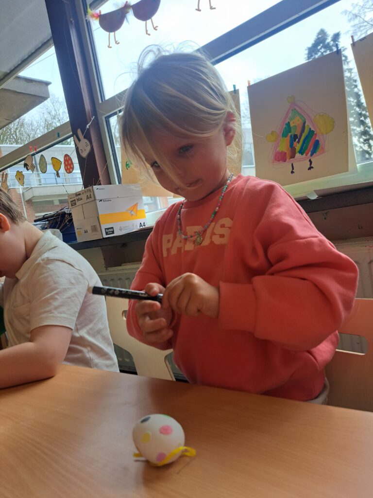 De laatste twee weken voor de paasvakantie zaten de kleuters helemaal in de paassfeer! We mochten eitjes versieren, kuikentjes ontmoeten, met de B-bot spelen, een eierzoektocht doen op de speelplaats, pijlen tekenen voor de paashaas, een paasmandje knutselen… Heel wat te beleven dus!