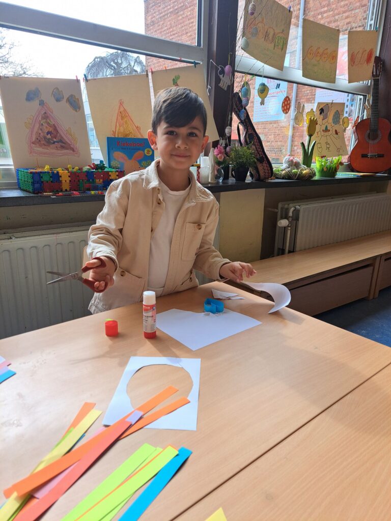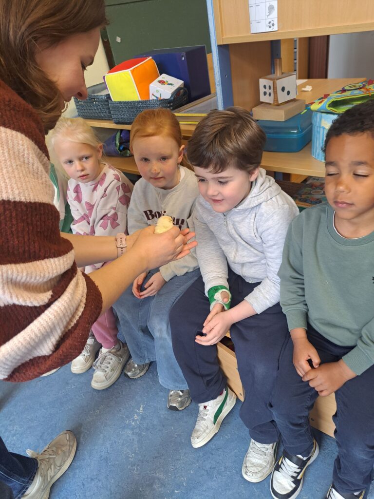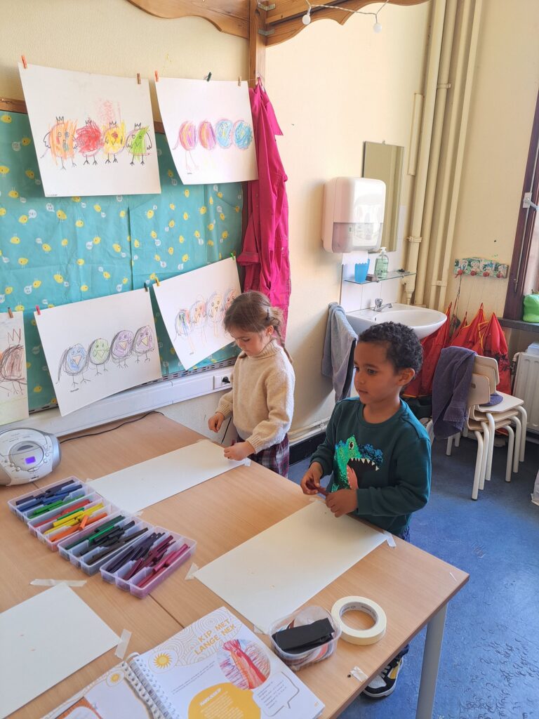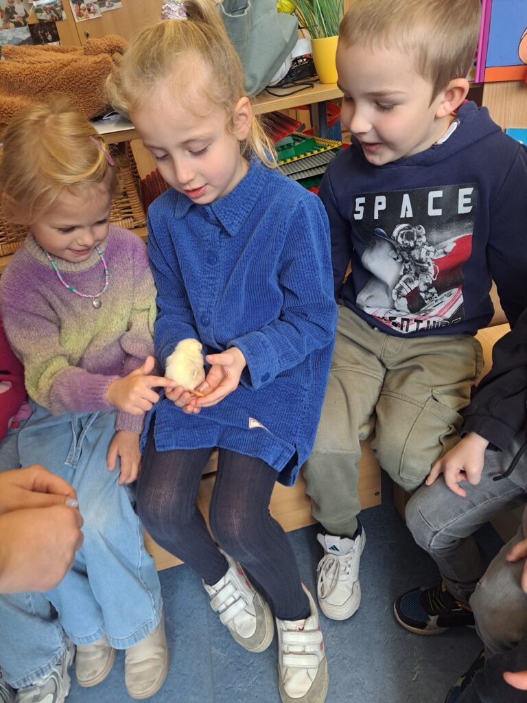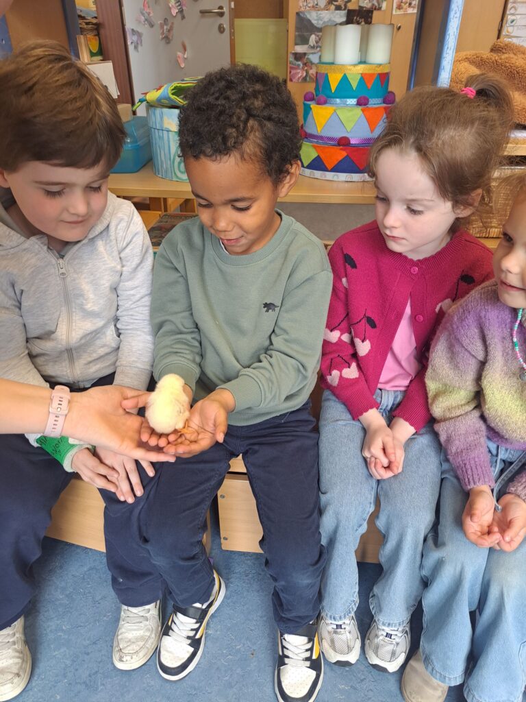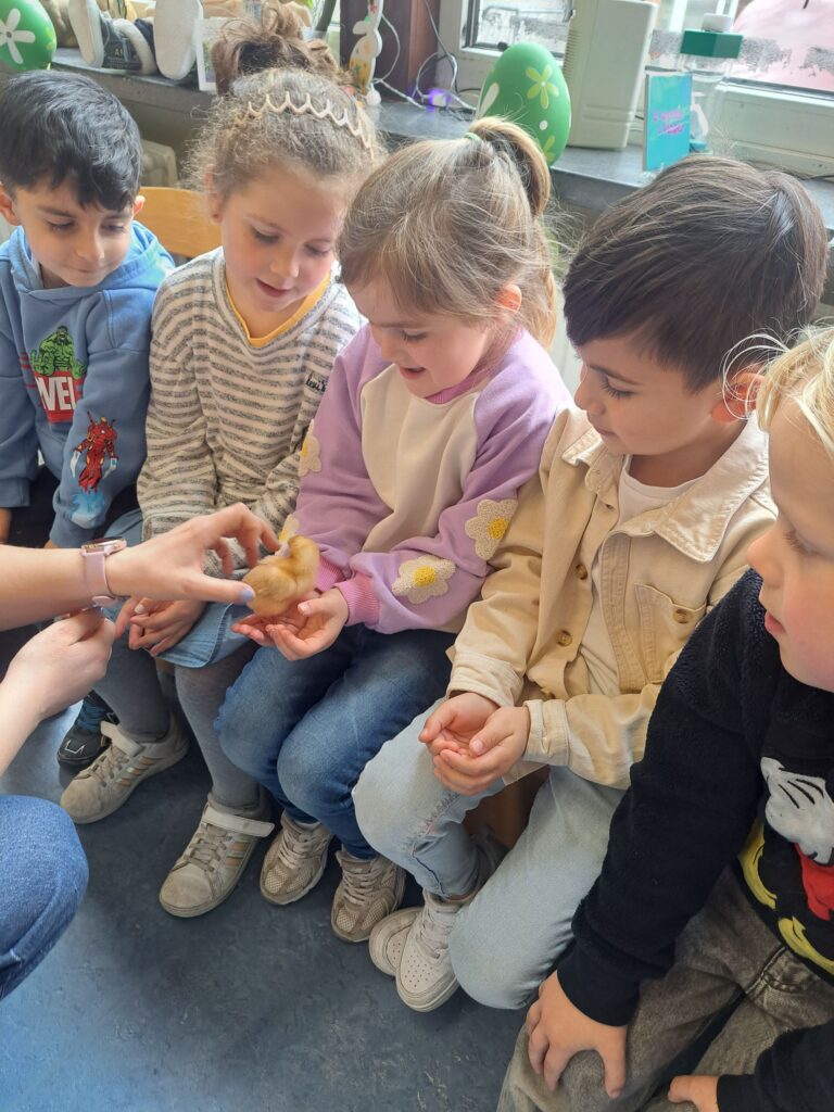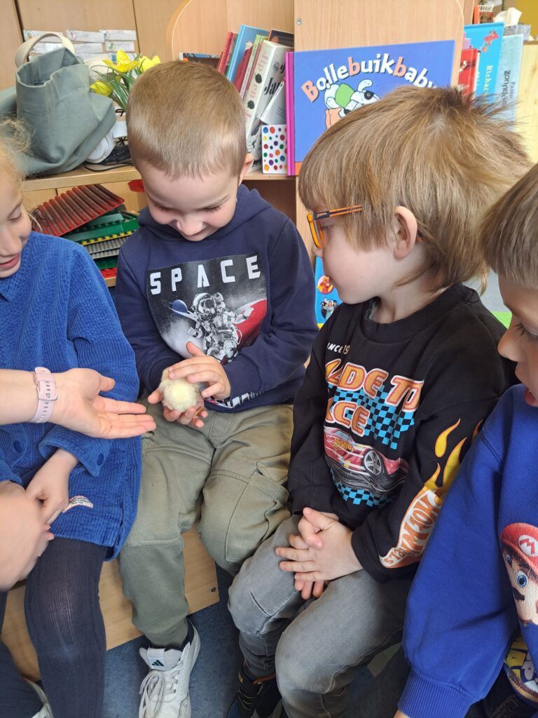 De laatste twee weken voor de paasvakantie zaten de kleuters helemaal in de paassfeer! We mochten eitjes versieren, kuikentjes ontmoeten, met de B-bot spelen, een eierzoektocht doen op de speelplaats, pijlen tekenen voor de paashaas, een paasmandje knutselen… Heel wat te beleven dus!