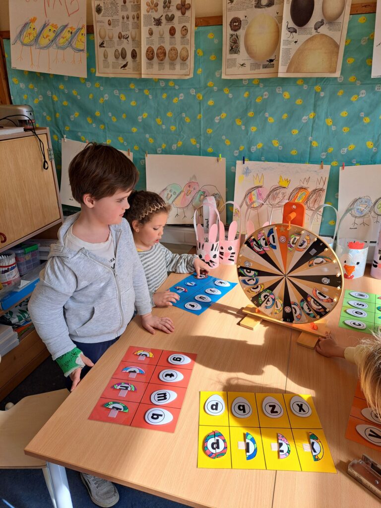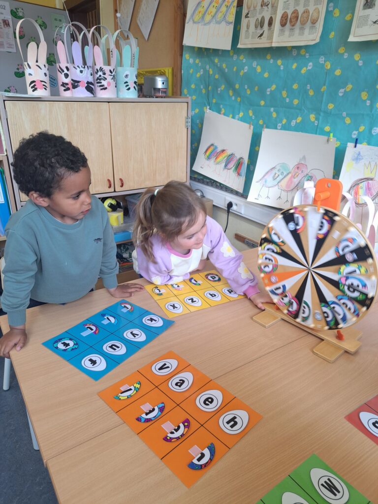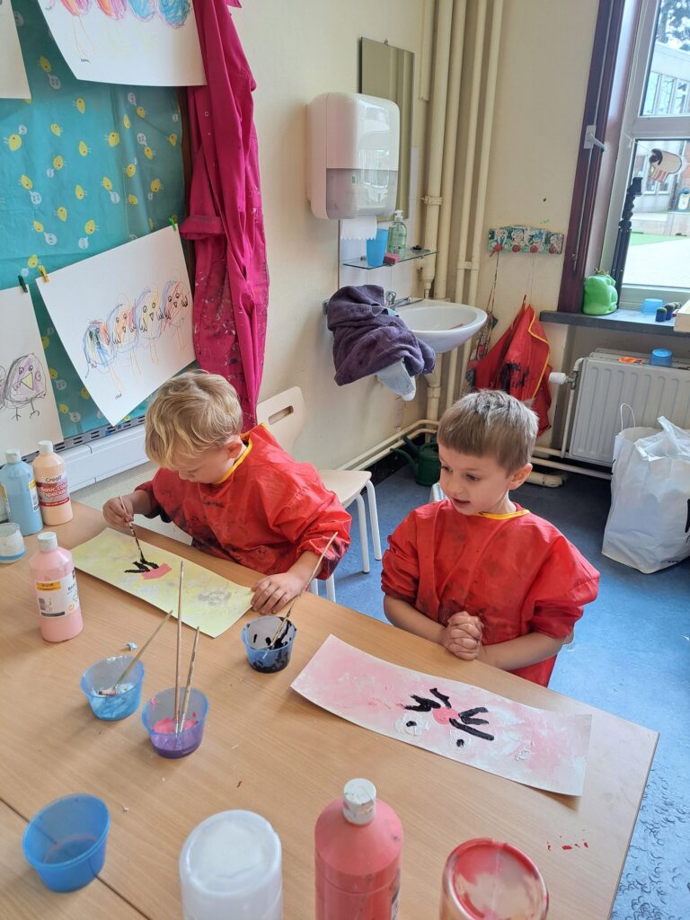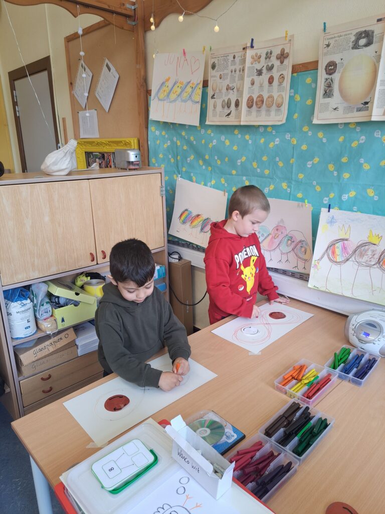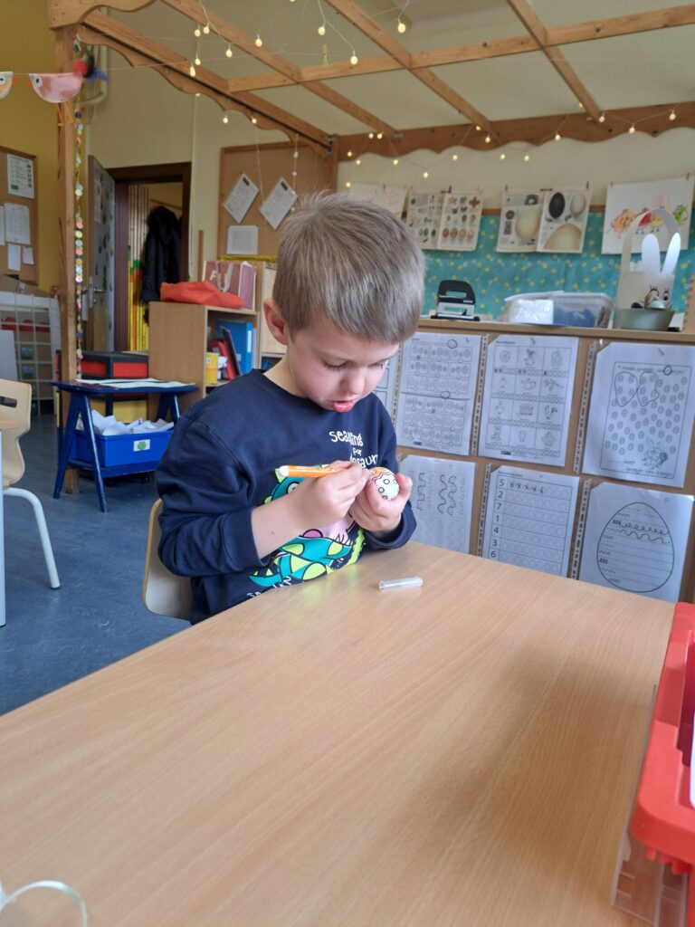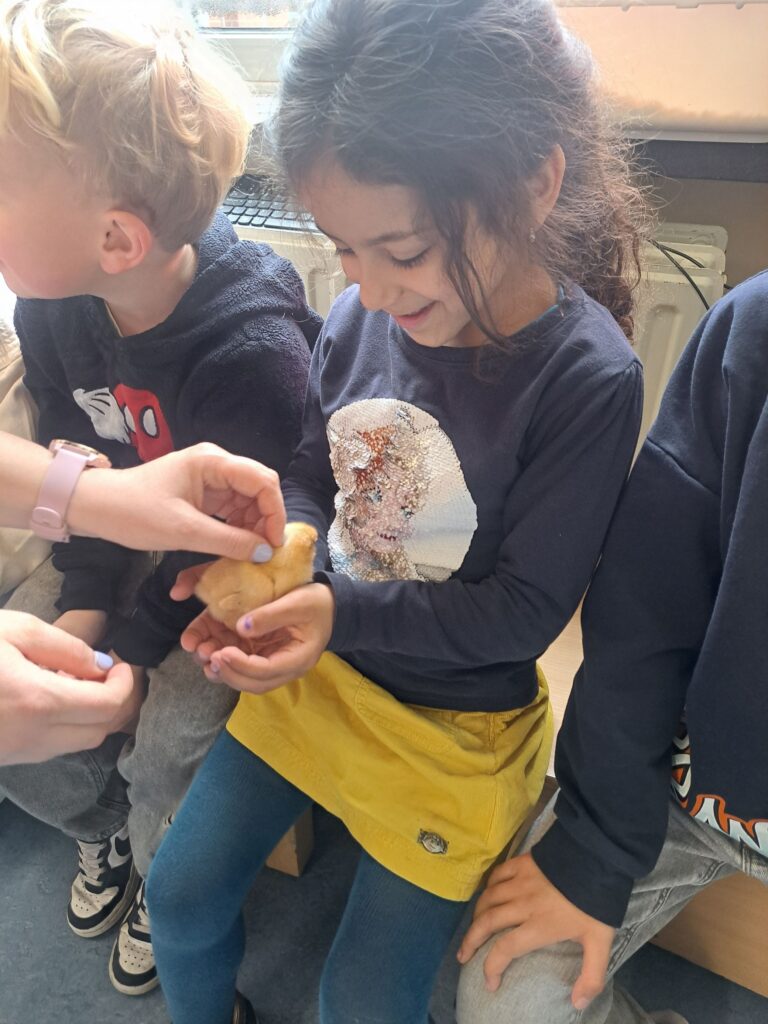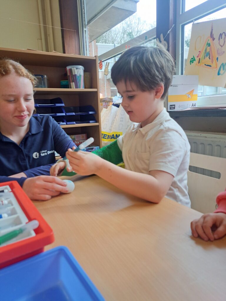 De laatste twee weken voor de paasvakantie zaten de kleuters helemaal in de paassfeer! We mochten eitjes versieren, kuikentjes ontmoeten, met de B-bot spelen, een eierzoektocht doen op de speelplaats, pijlen tekenen voor de paashaas, een paasmandje knutselen… Heel wat te beleven dus!