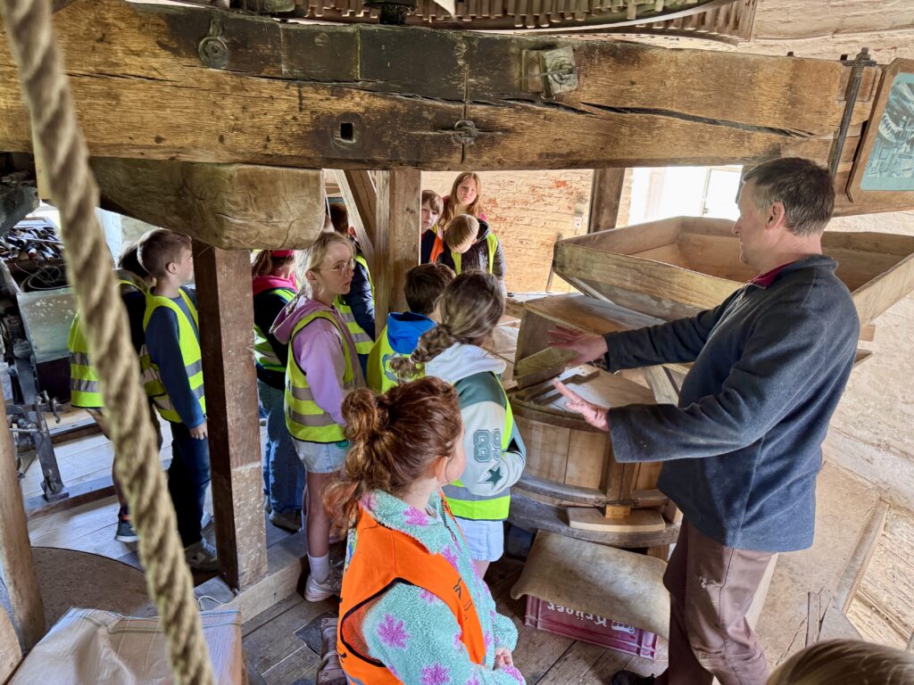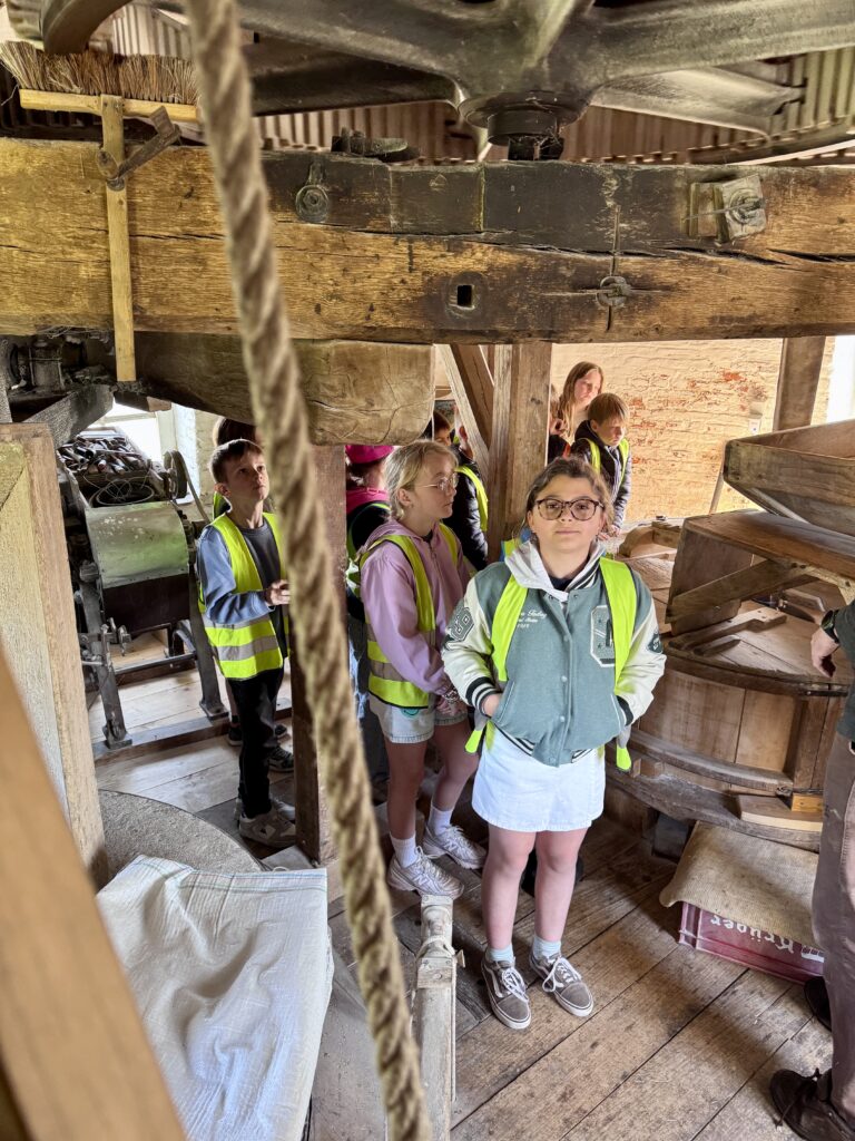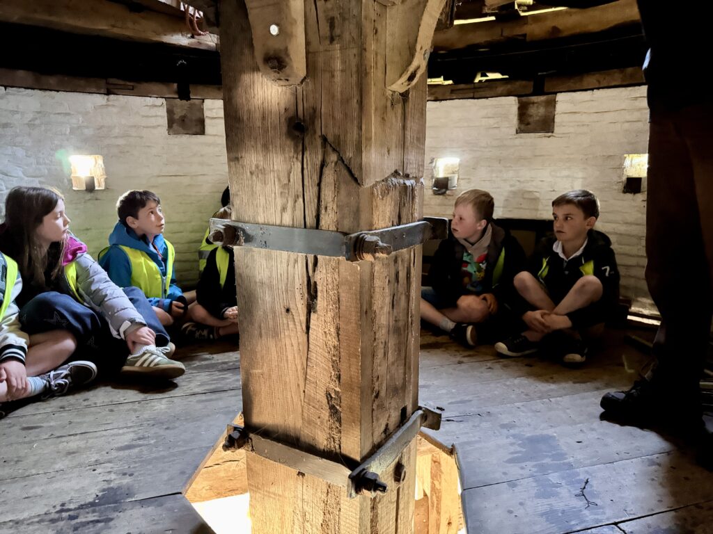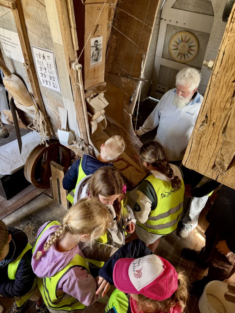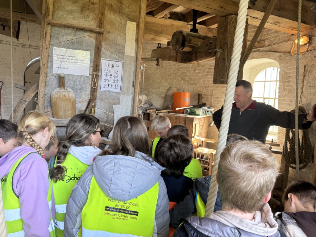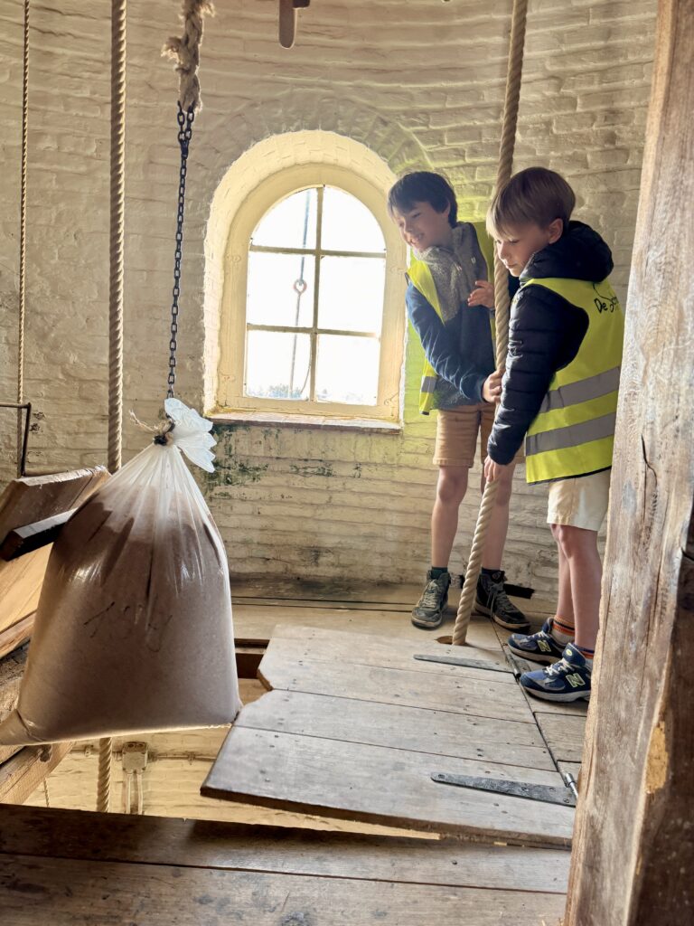 We mochten helemaal tot boven in de windmolen klimmen! We trokken zakken op en zagen heel wat tandwielen draaien.